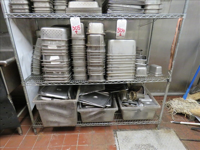 LOT, ASSORTED SS & ALUMINUM PANS ON THESE (2) SHELVES