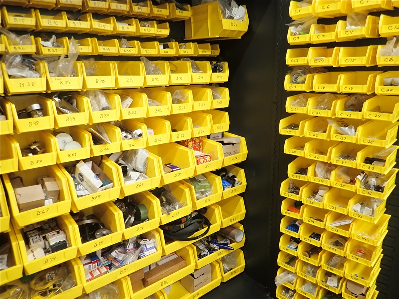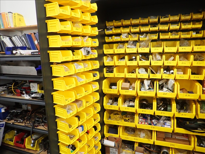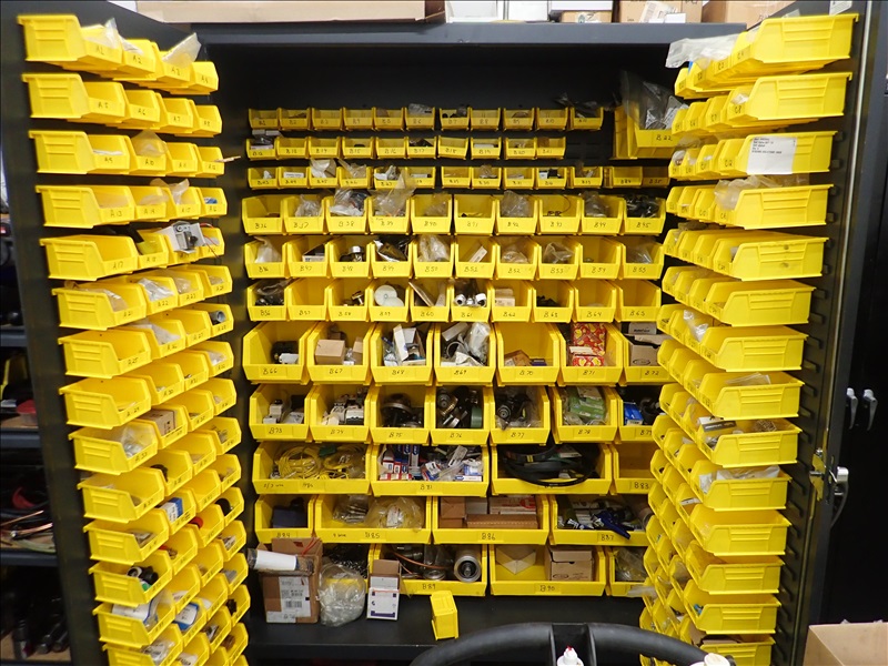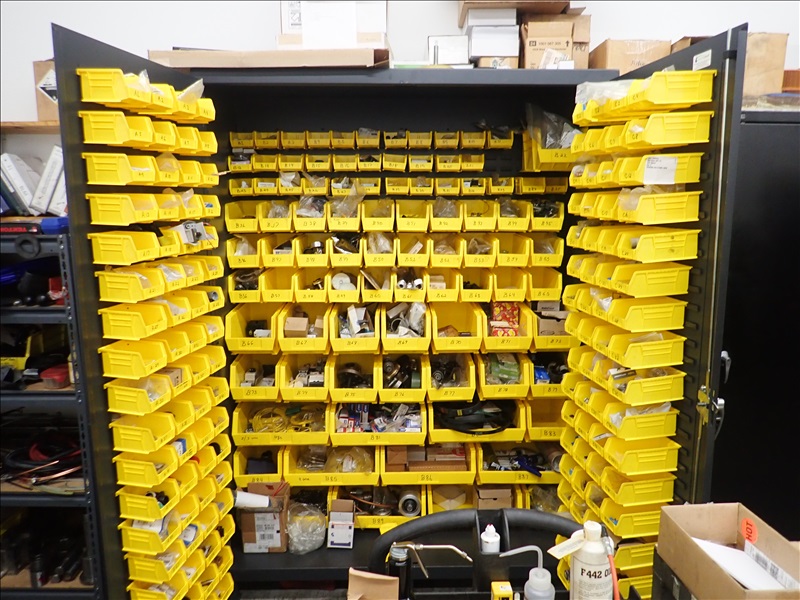 GROUP OF 60" 2-DOOR PARTS CABINET W/ASSORTED MACHINE PARTS AND PARTS BINS