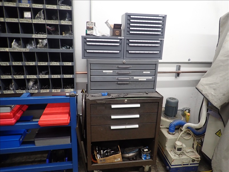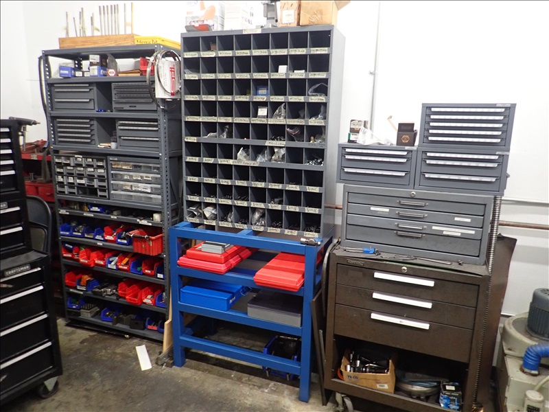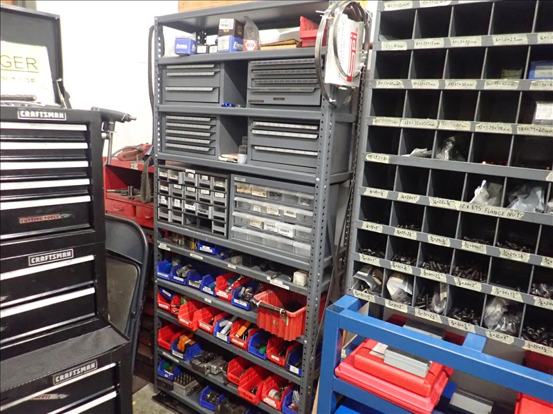 GROUP OF TOOLS,PUNCHES, DRILLS, END MILLS, BOLTS, TAP, & DIE SET, GAUGES, TOOLBOX, TOOLING & MISC. SHOP SUPPLIES
