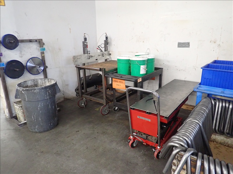 GROUP OF SHELVING , FIXTURE RACK, FIXTURES, TOOL CART, SCISSOR LIFT CARTS, DIES & MISC.