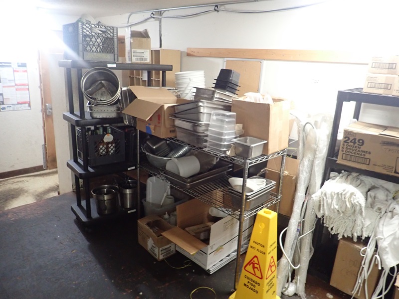 GROUP OF STORAGE AREA TO INCLUDE: PLATES, SHELVING, WARMER, INSERTS, GLASSWARE, SLICER & MISC. SUPPLIES