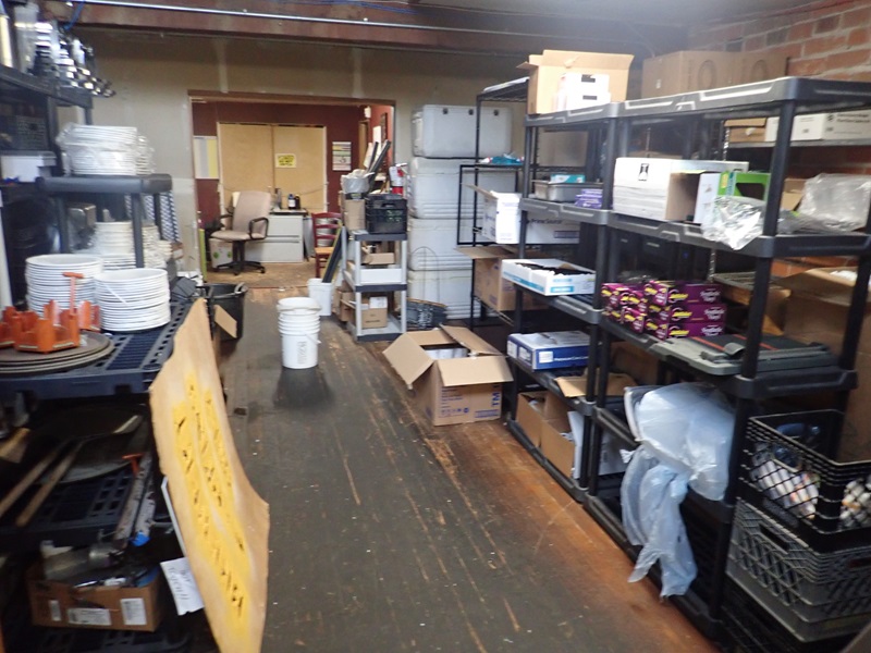 GROUP OF STORAGE AREA TO INCLUDE: COOLERS, SHELVING, PLATES, WARMERS, HOT BOX, DISPENSERS & MISC. RESTAURANT SUPPLIES