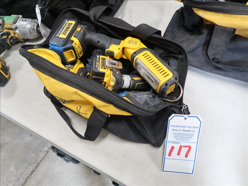 LOT, DEWALT DCD996 20V CORDLESS 1/2" HAMMERDRILL/DRILL DRIVER DCF887 1/4" IMPACT DRIVER, DCL050 WORK LIGHT W/BATTERIES, CHARGER & BAG