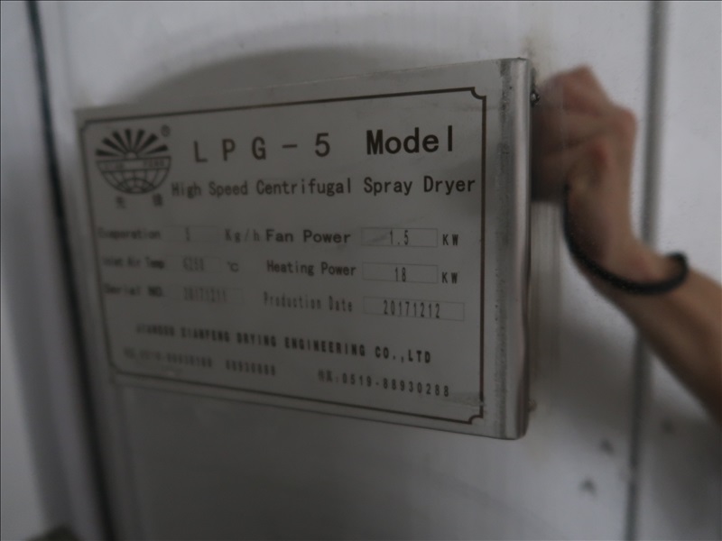 S/S HIGH SPEED CENTIFUGAL SPRAY DRYER, SIEMENS SIMATIC HMI DIGITAL CONTROLS, 1.5KW FAN POWER, 18KW HEATING POWER, 5KG/H EVAPORATION, <250 C INLET AIR TEMP