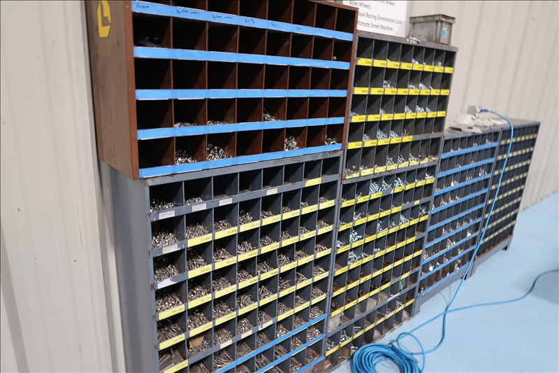 GROUP OF STRONWAY 1,000 LB. ROLLING TRANSMISSION JACK, LINCOLN DRAIN CART, FLOOR JACKS, JACK STANDS & BOLT BINS