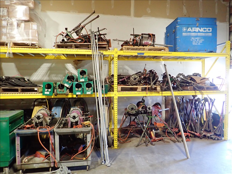 GROUP OF (8) RIDGID 300 MACHINES, TRI-STANDS, HOT BOXES, REEL PULLERS, CORDS & MISC.