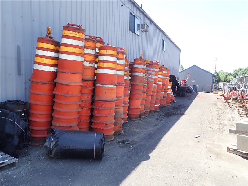 GROUP OF TRAFFIC BARRELS, CONES, SIGNS, STANDS, CANDLE STICKS & ASSORTED SAFETY SUPPLIES