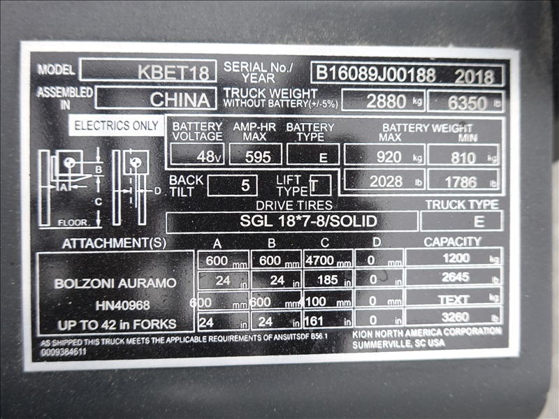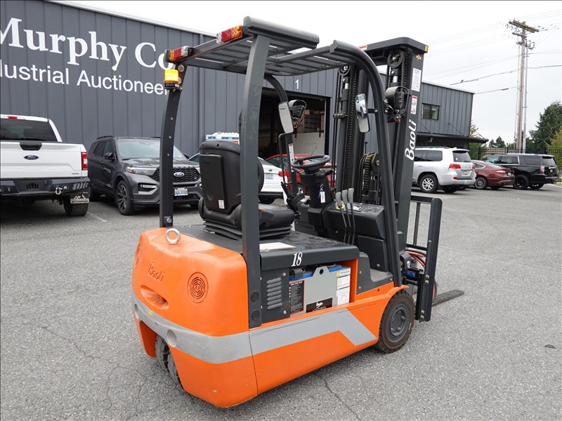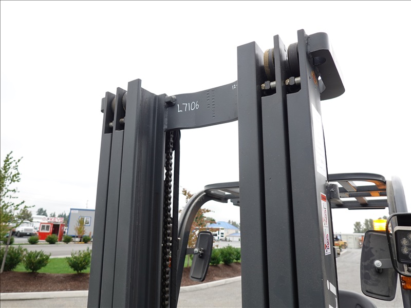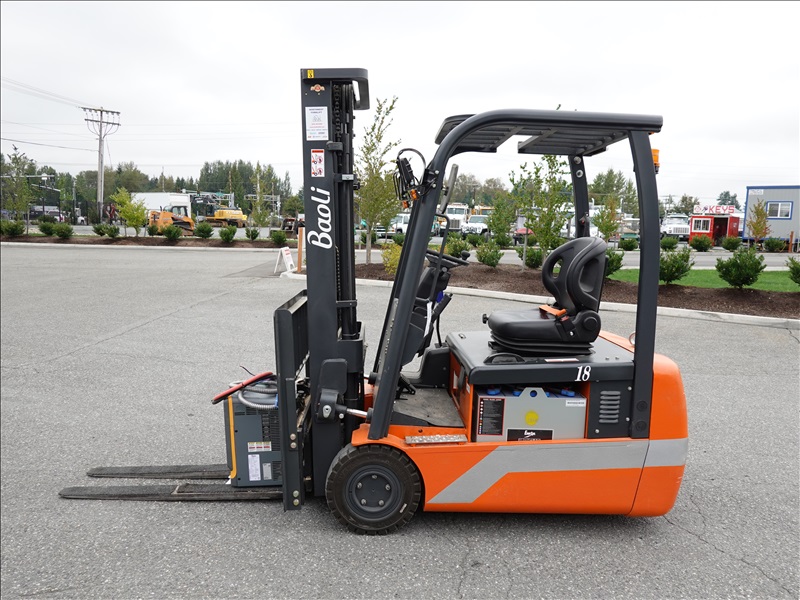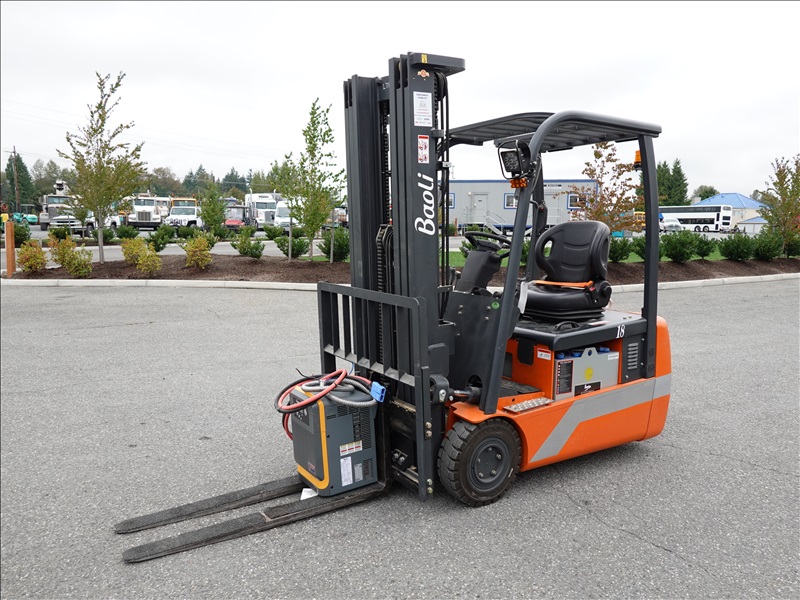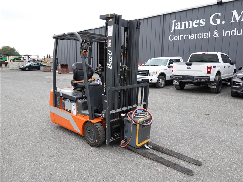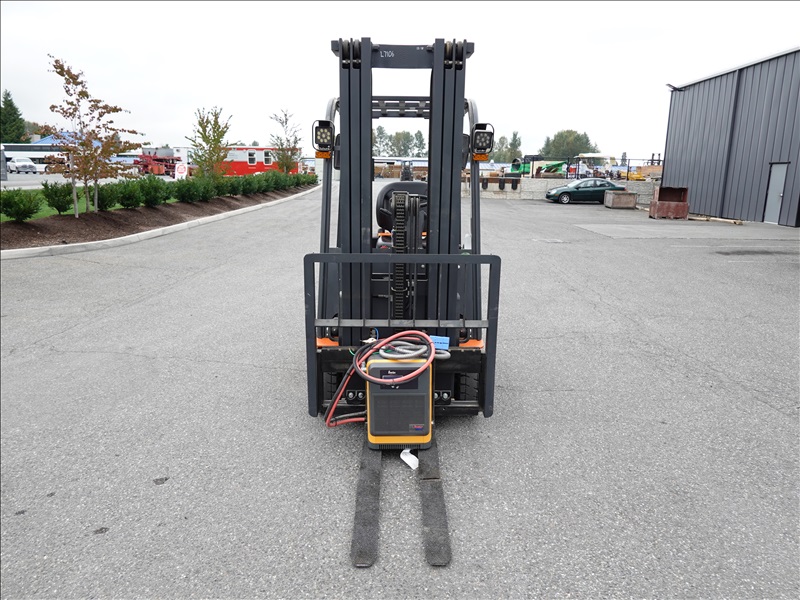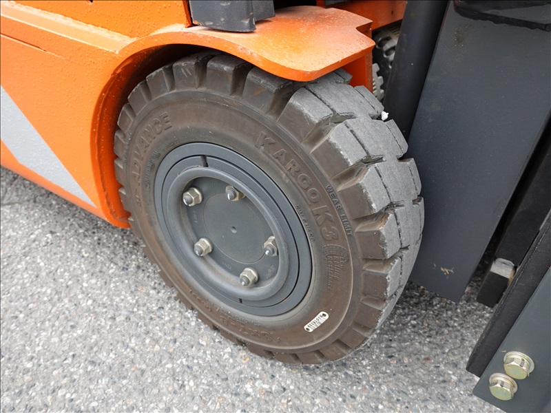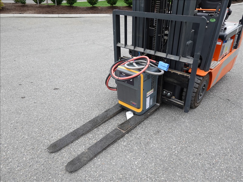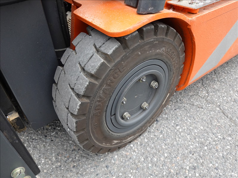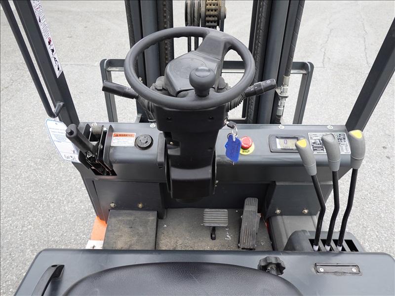 3,260 LB ELECTRIC SOLID AIR TIRE FORKLIFT, 161" FORK HEIGHT, 3-STAGE MAST, SIDE SHIFT, CHARGER