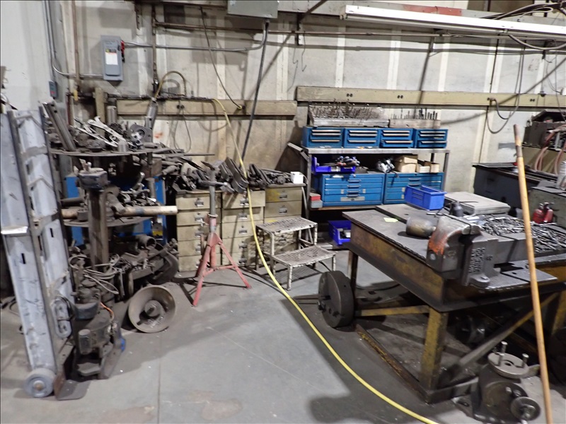 WELD TABLE, LATHE TOOLING, DRILLS, VISE, ANVIL, STANDS & MISC.