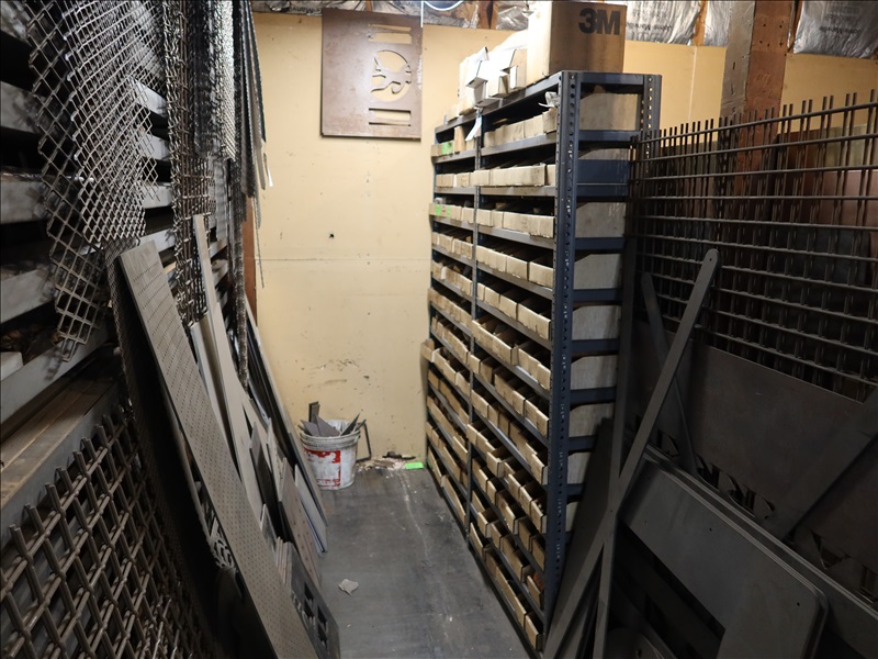 ASSORTED PARTS & SUPPLIES ON THESE (2) METAL SHELVES W/METAL CABINETS (BUYER MUST TAKE PARTS BINS)