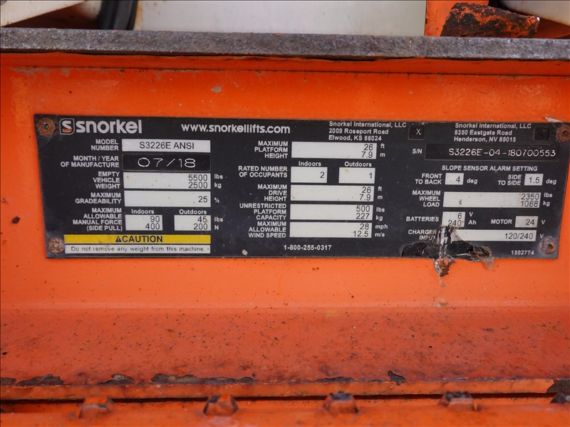 SCISSOR LIFT, 26' PLATFORM HEIGHT, 500 LB CAPACITY, A/C RECEPTACLE AT PLATFORM, 24V ELECTRIC (ELECTRICAL ISSUE, NO POWER, NO READ OUT ON HOUR METER)