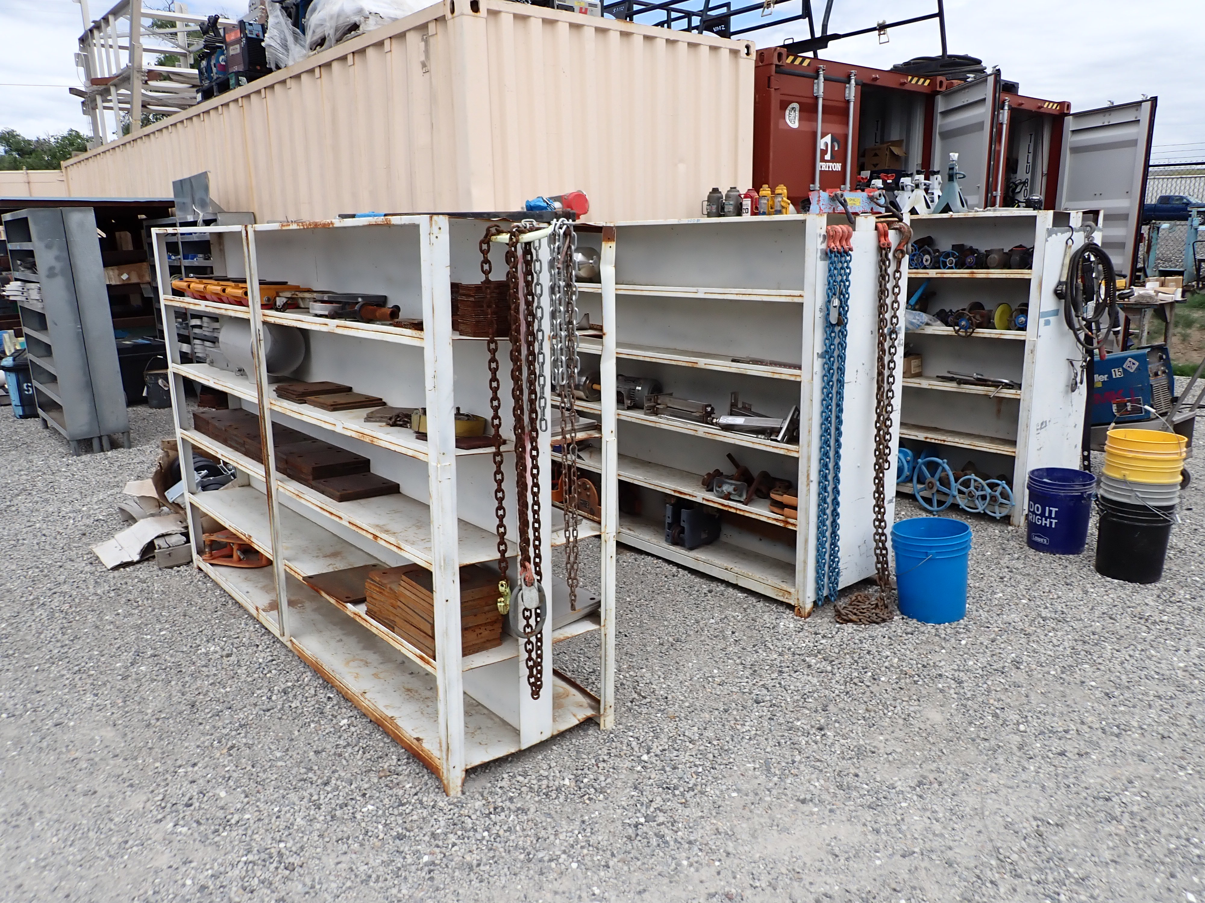 SHELVING UNITS W/PLATES, RIGGING, VALVES, SKATES & MISC.