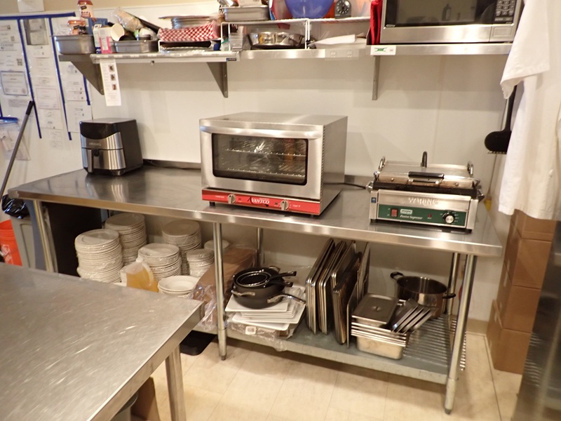 S/S TABLE W/PLATES, SHEET PANS, AIR FRYER, S/S INSERTS, S/S SHELF UNITS, MICROWAVE & MISC. KITCHEN SUPPLIES