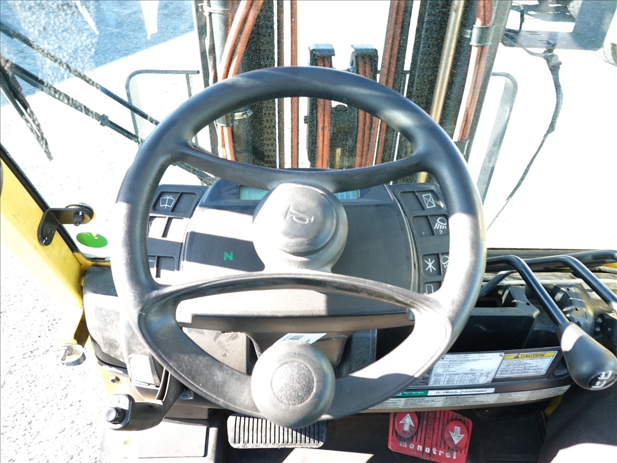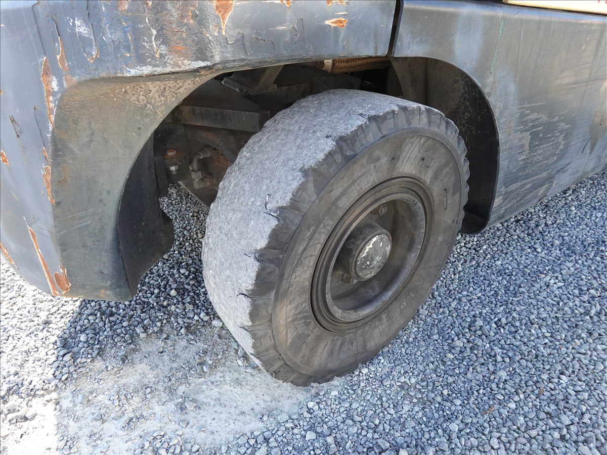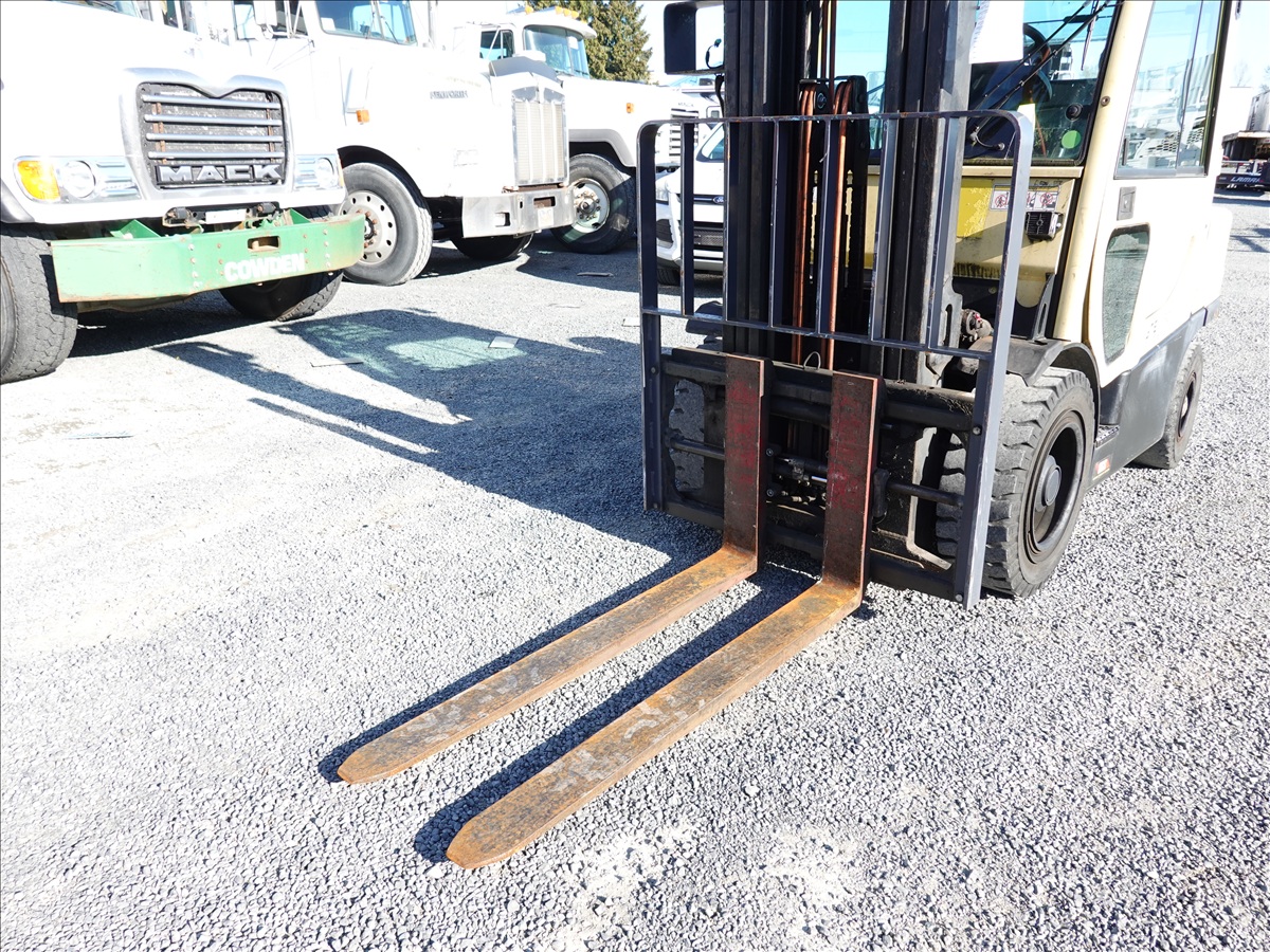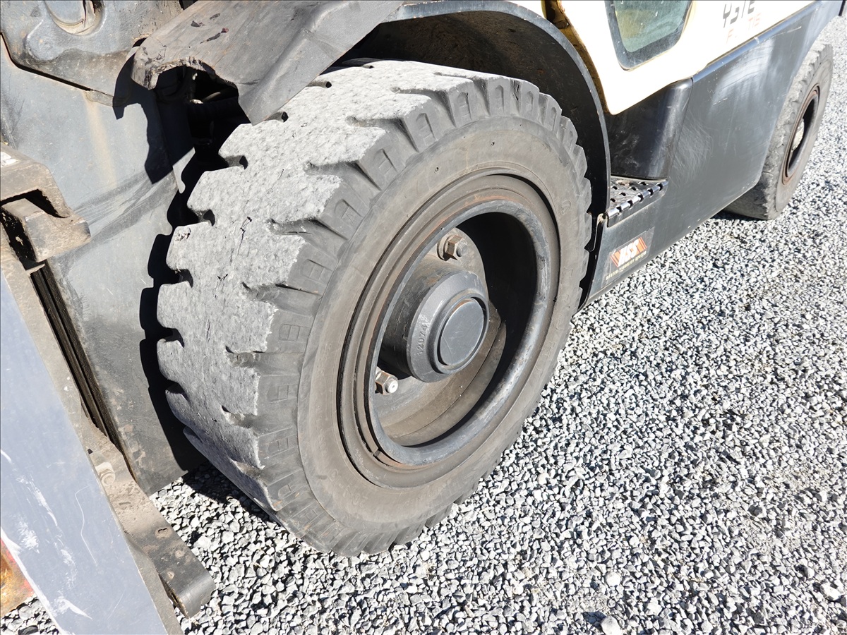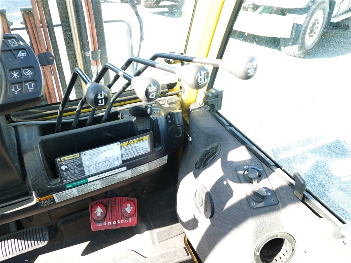5,350 LB SOLID TIRE FORKLIFT, 181" FORK HEIGHT, 3-STAGE MAST, SIDE SHIFT, FORK POSITIONERS, 54" FORKS, 4 CYL LPG, CAB (UNABLE TO READ HOUR METER, SEE PHOTO)