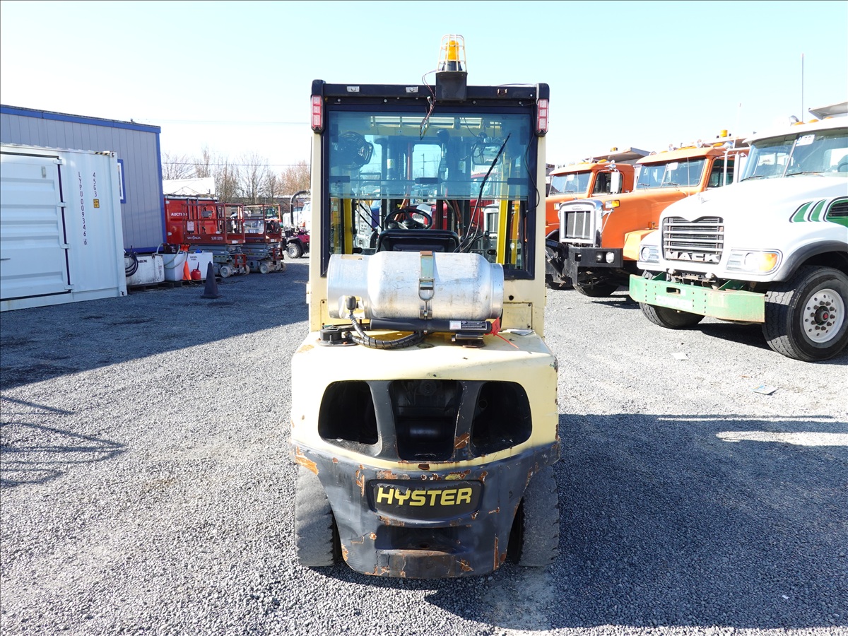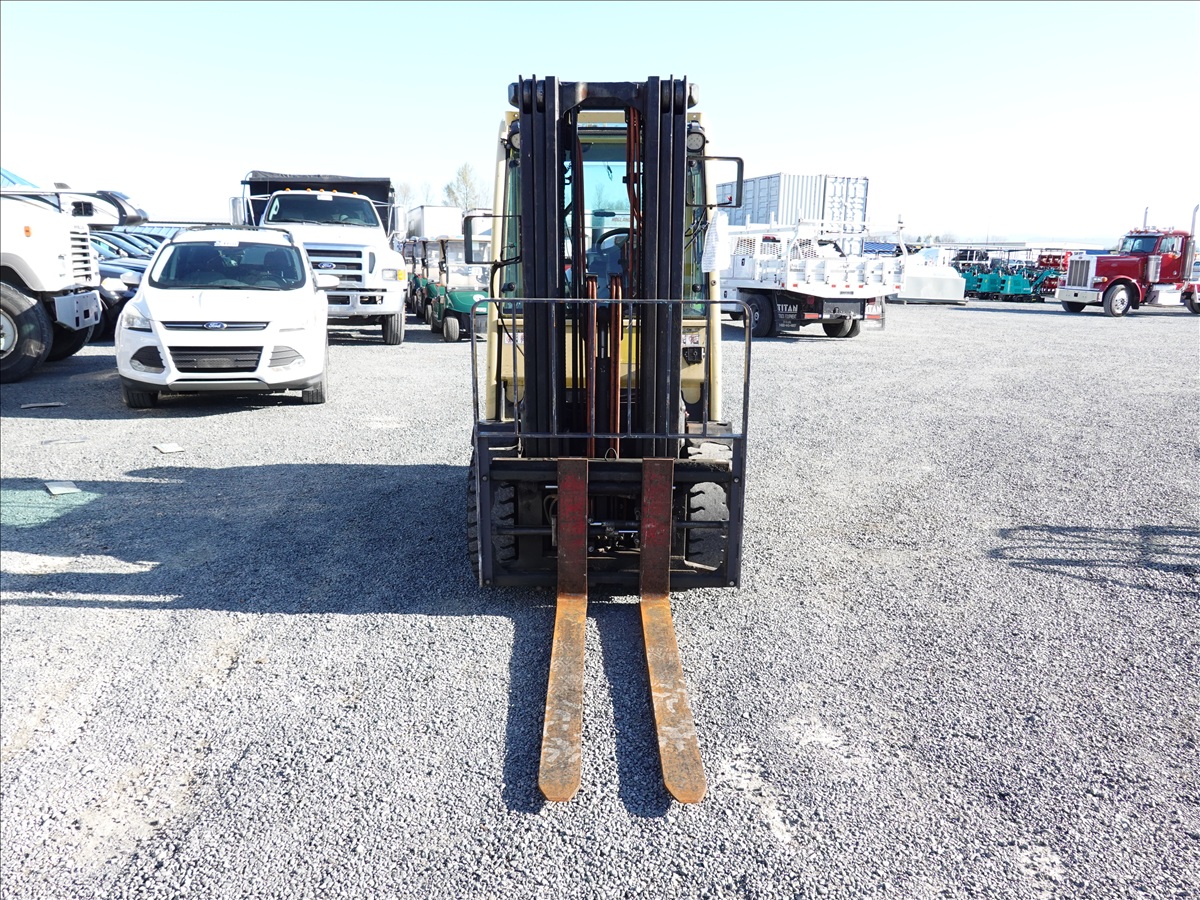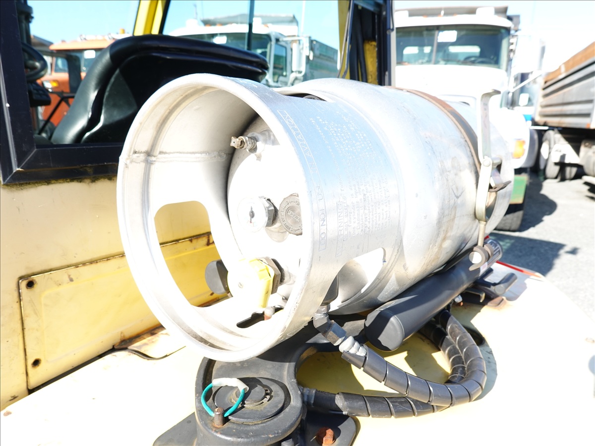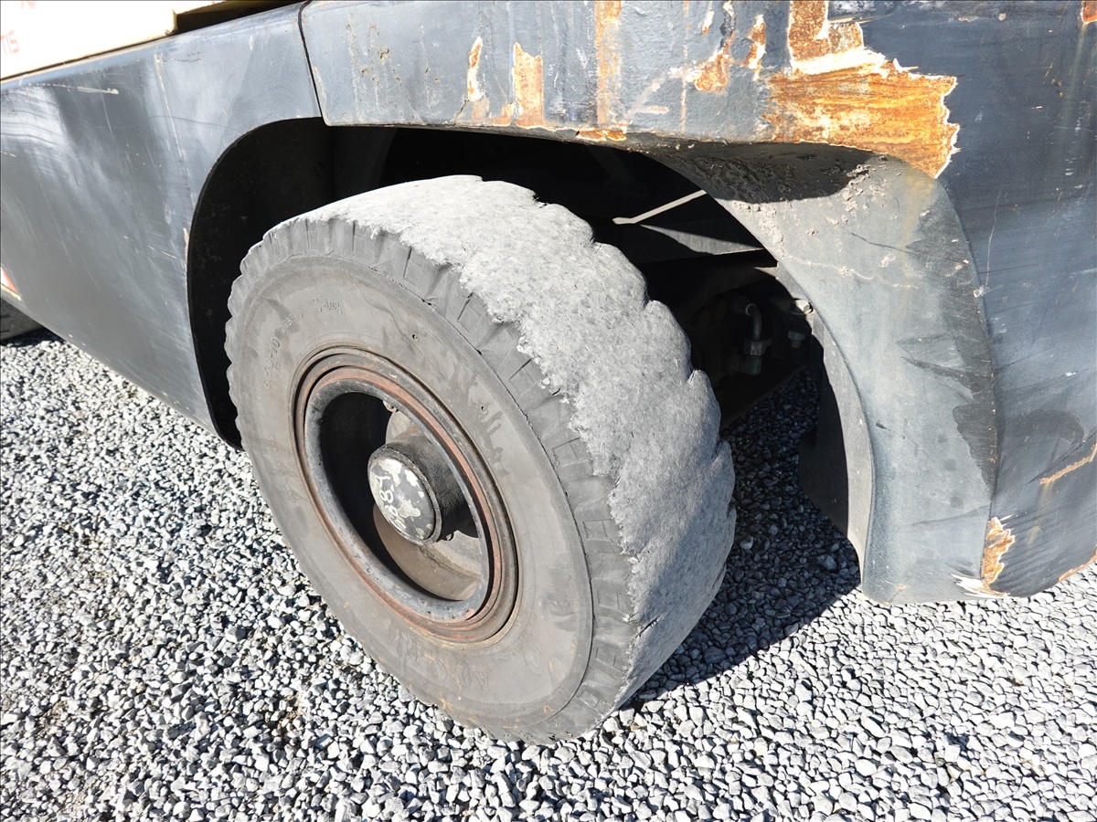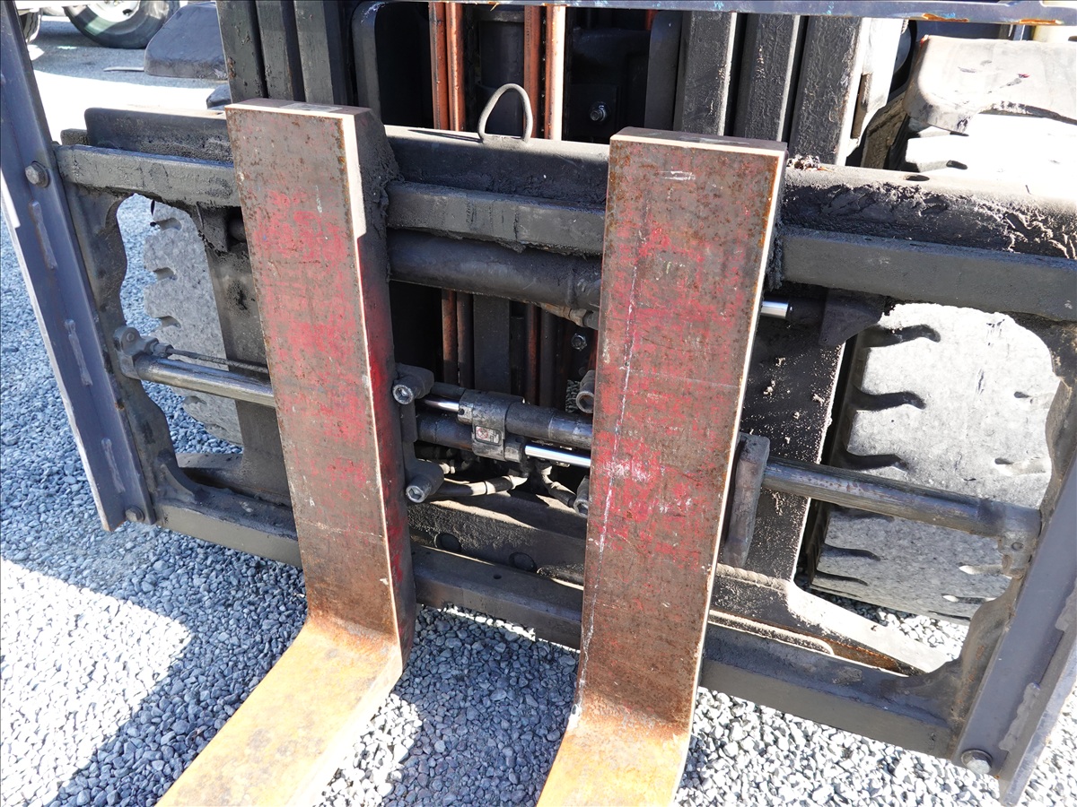 5,350 LB SOLID TIRE FORKLIFT, 181" FORK HEIGHT, 3-STAGE MAST, SIDE SHIFT, FORK POSITIONERS, 54" FORKS, 4 CYL LPG, CAB (UNABLE TO READ HOUR METER, SEE PHOTO)