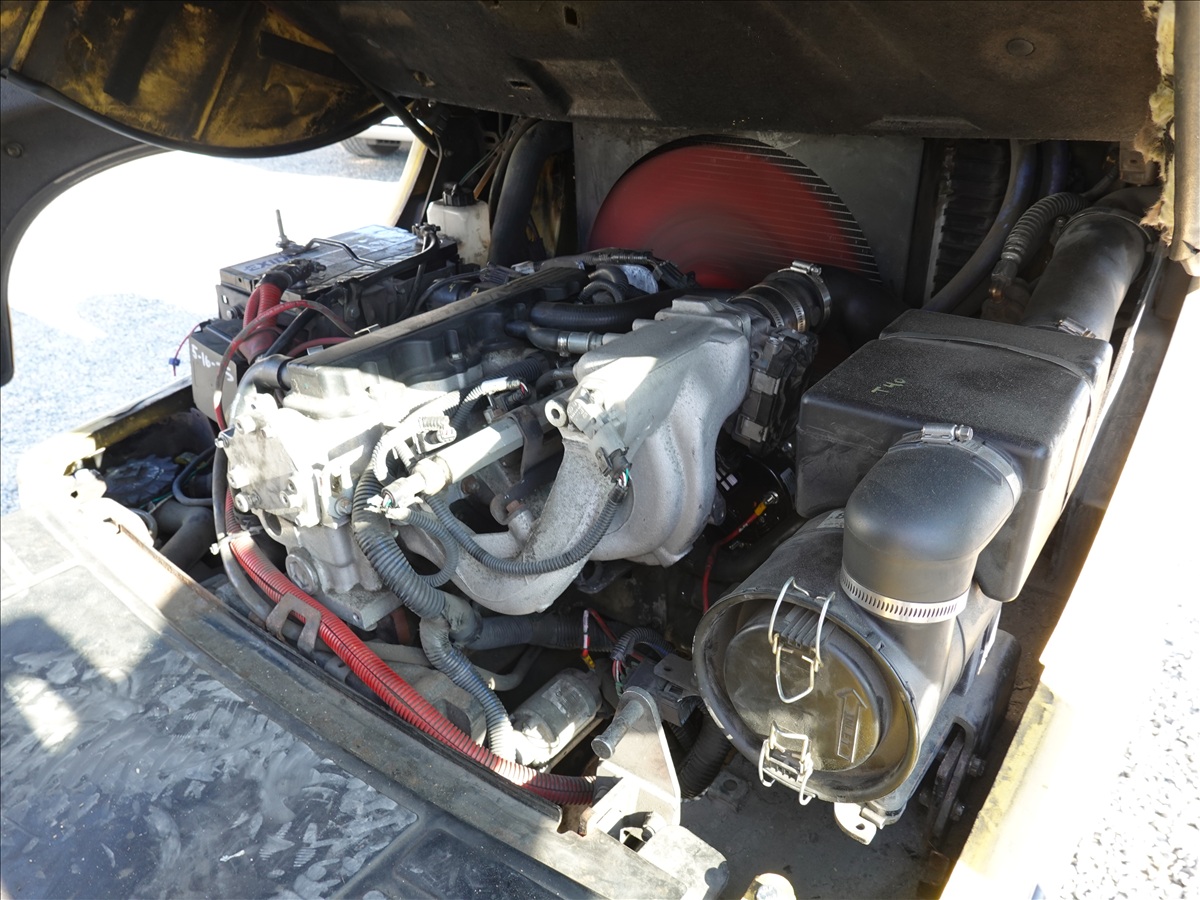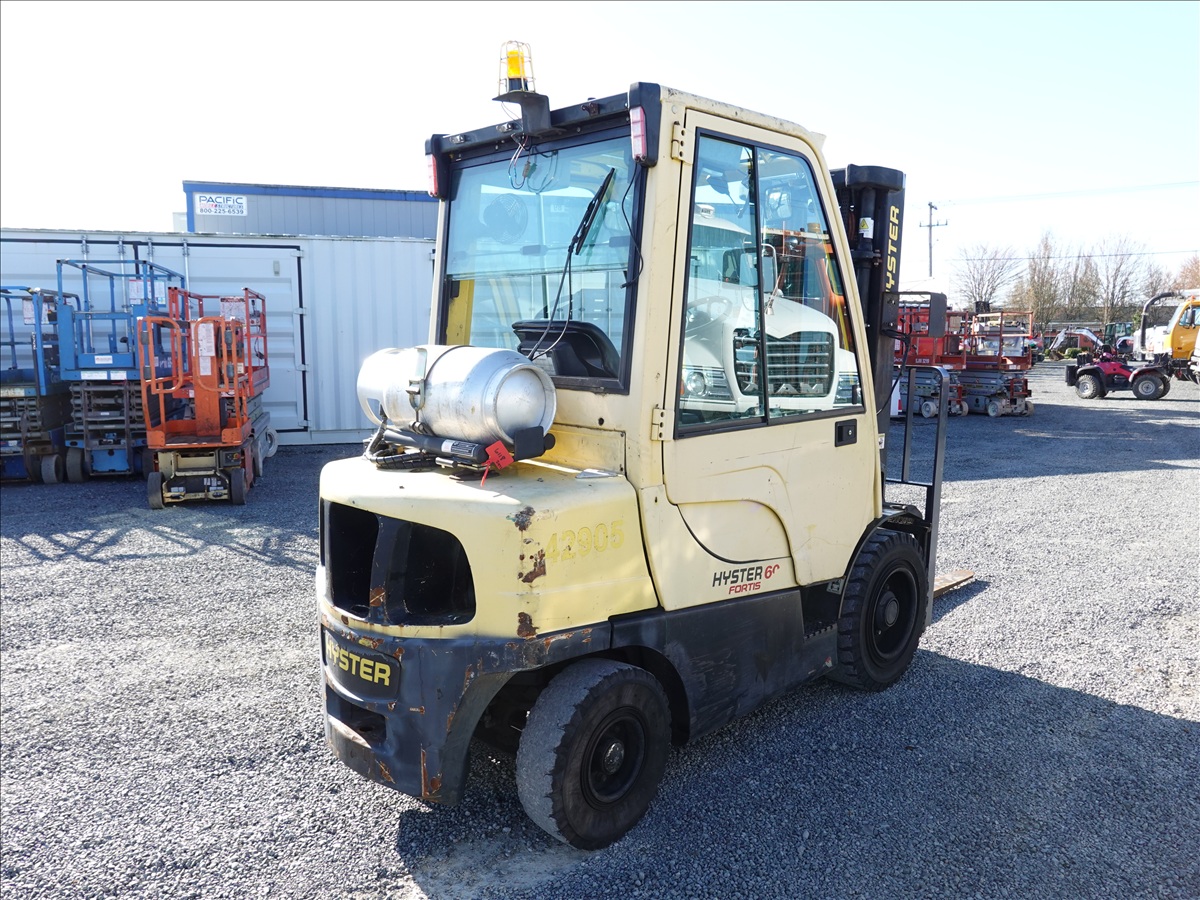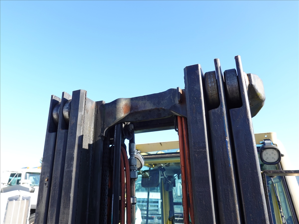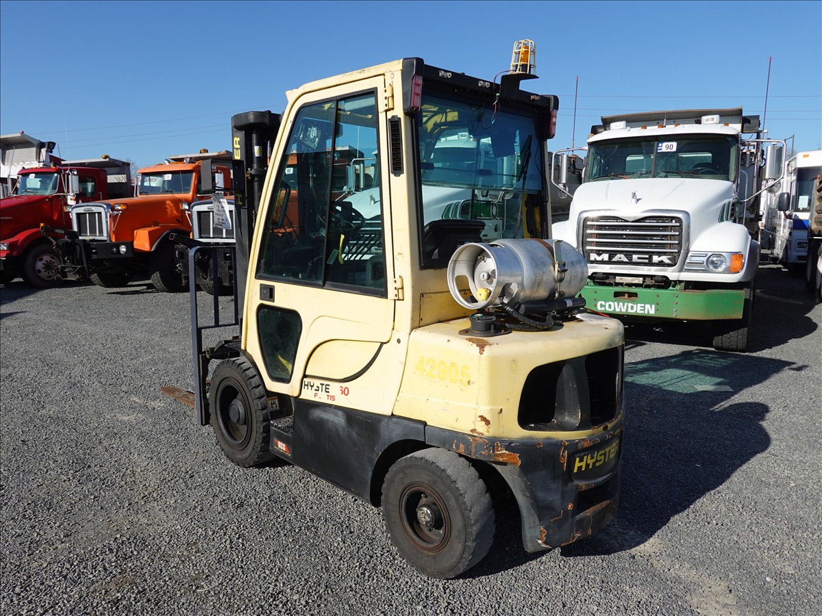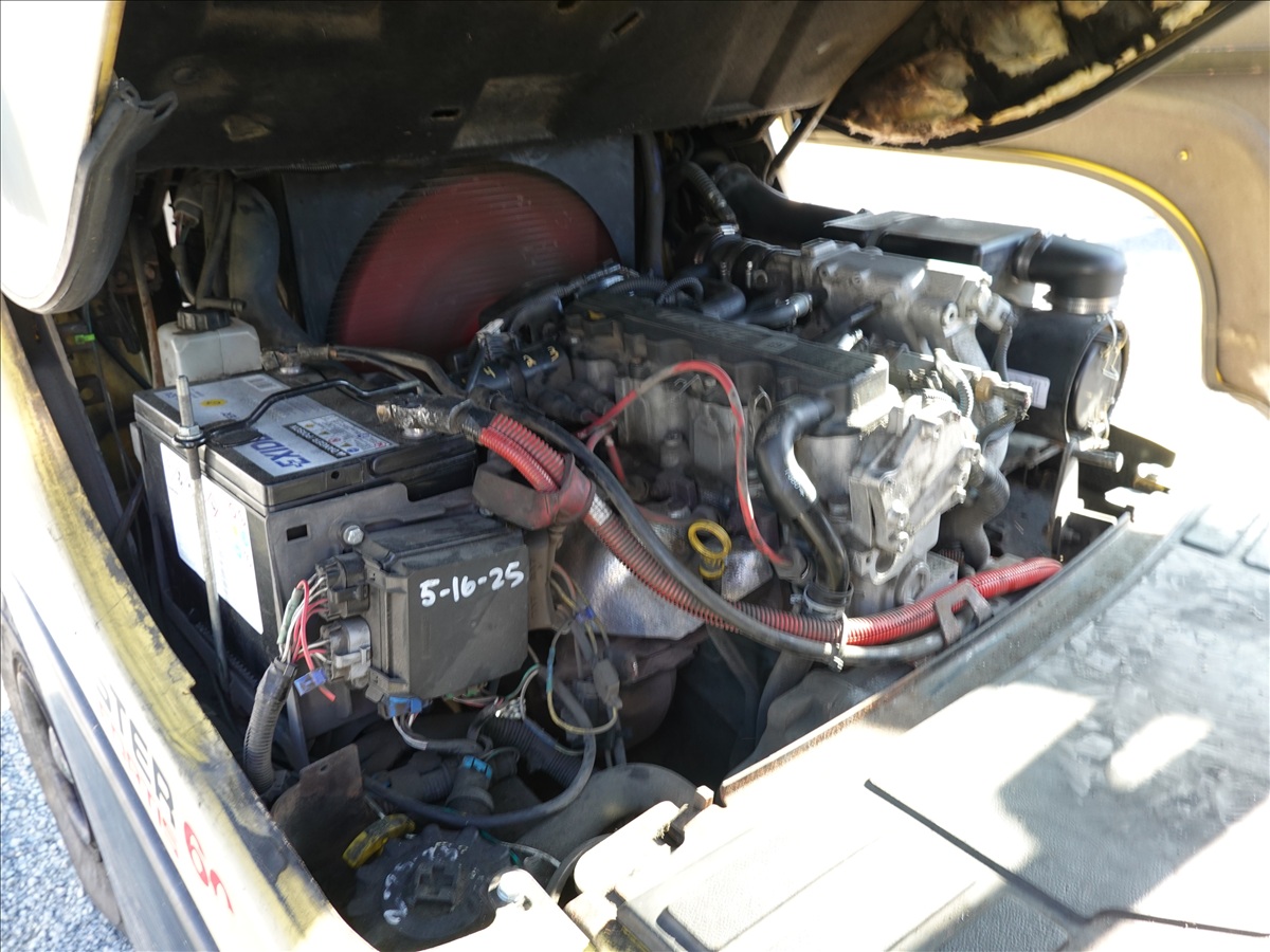 5,350 LB SOLID TIRE FORKLIFT, 181" FORK HEIGHT, 3-STAGE MAST, SIDE SHIFT, FORK POSITIONERS, 54" FORKS, 4 CYL LPG, CAB (UNABLE TO READ HOUR METER, SEE PHOTO)