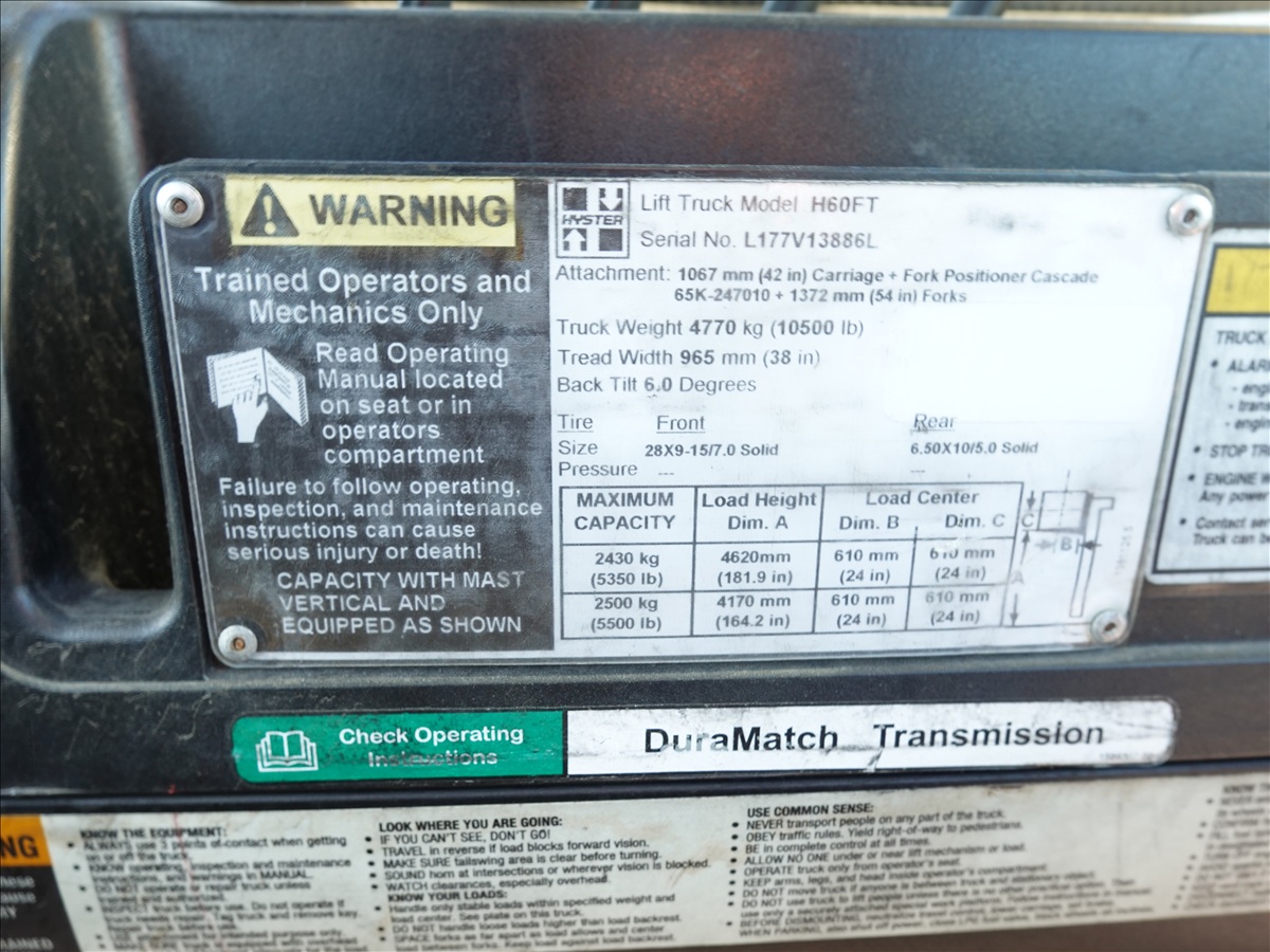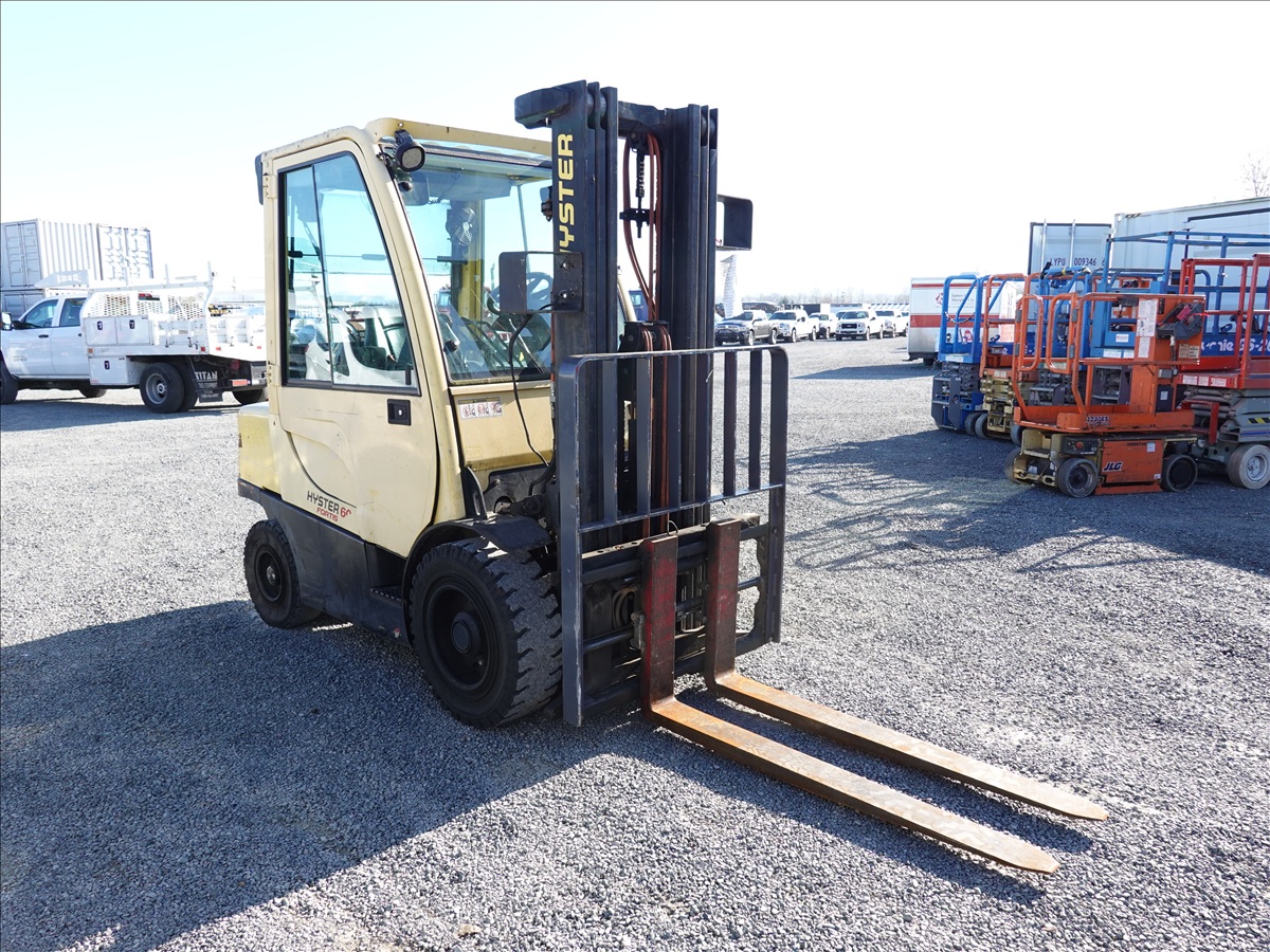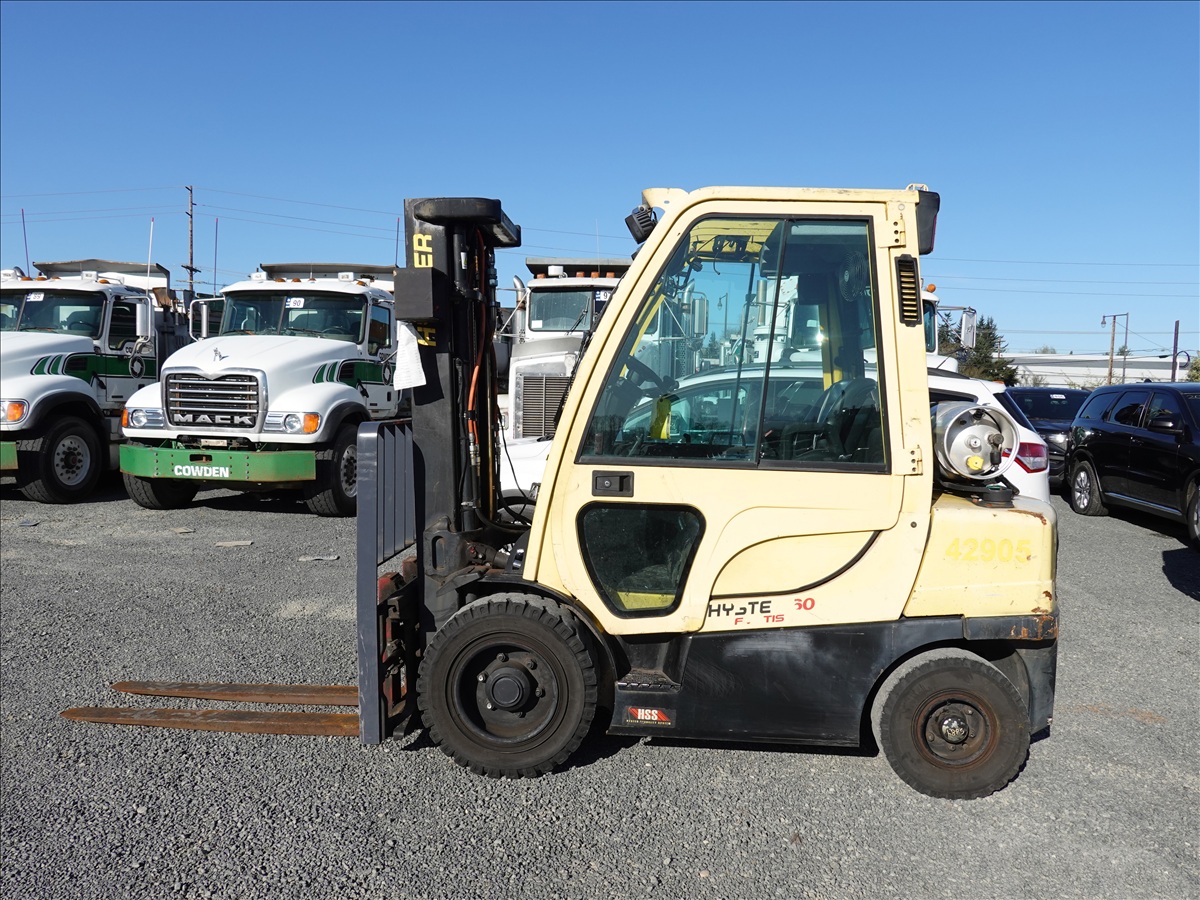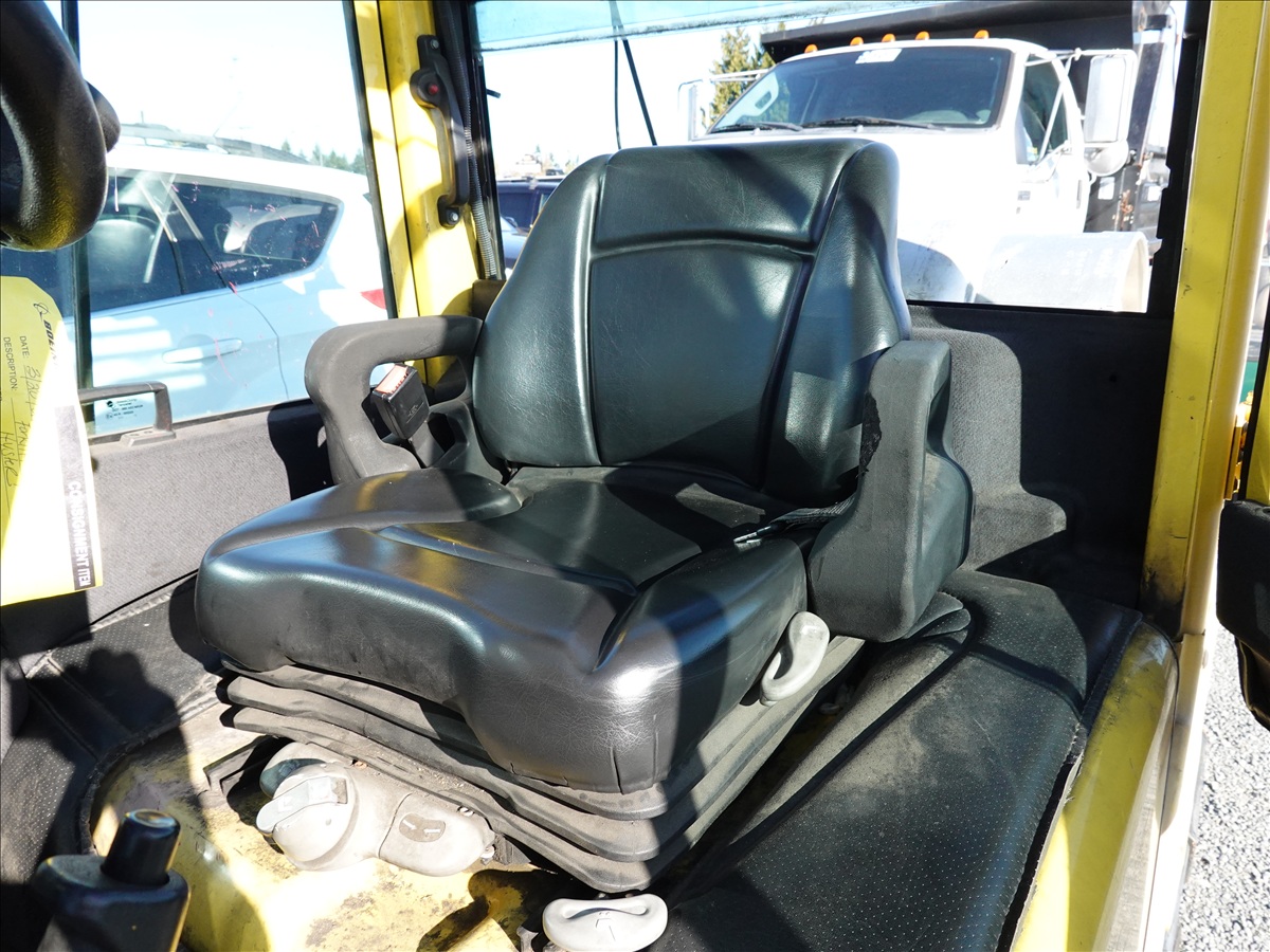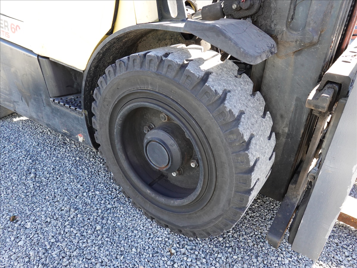 5,350 LB SOLID TIRE FORKLIFT, 181" FORK HEIGHT, 3-STAGE MAST, SIDE SHIFT, FORK POSITIONERS, 54" FORKS, 4 CYL LPG, CAB (UNABLE TO READ HOUR METER, SEE PHOTO)