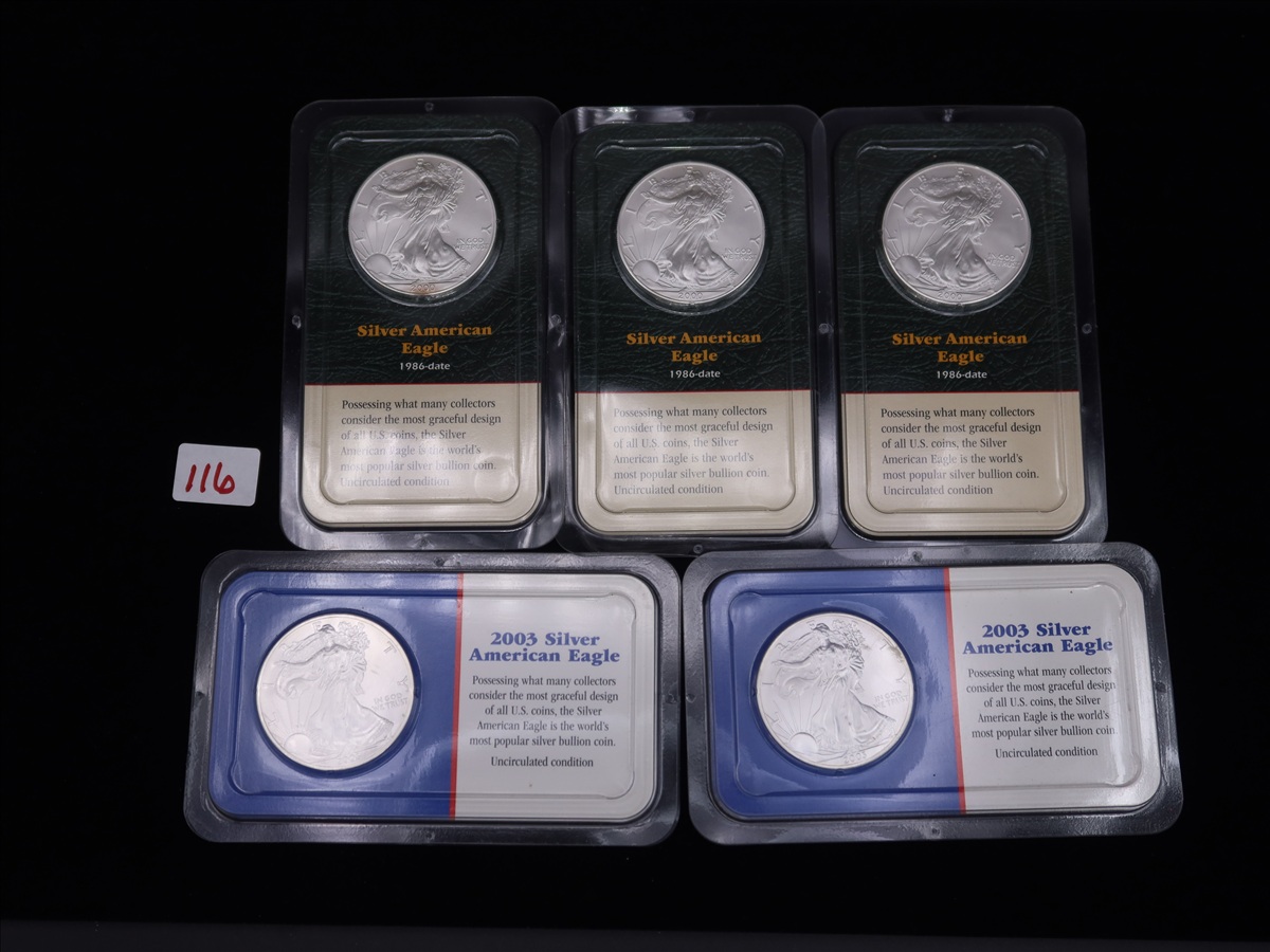 LOT, (3) 1986 & (2) 2003 SILVER EAGLES (5 TROY...