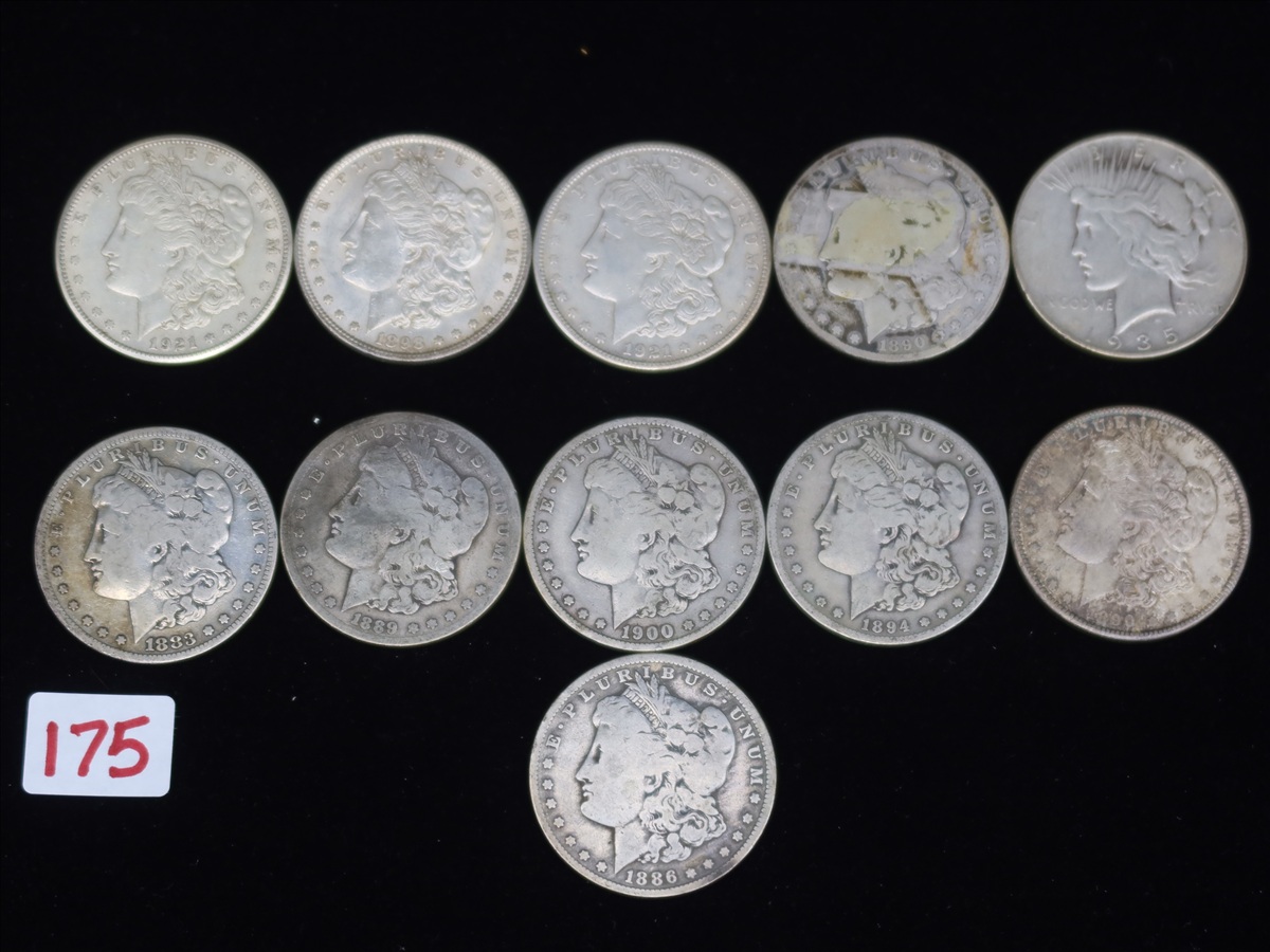 LOT, (10) MORGAN SILVER DOLLARS TO INCLUDE: (1) 1883-S, (1) 1886-O, (1) 1889-CC, (1) 1890-P, (1) 1894-S, (1) 1898-P, (1) 1900-O, (1) 1921-P, (1) 1921-S & (1) 1935-P PEACE SILVER DOLLAR IN THIS BAG