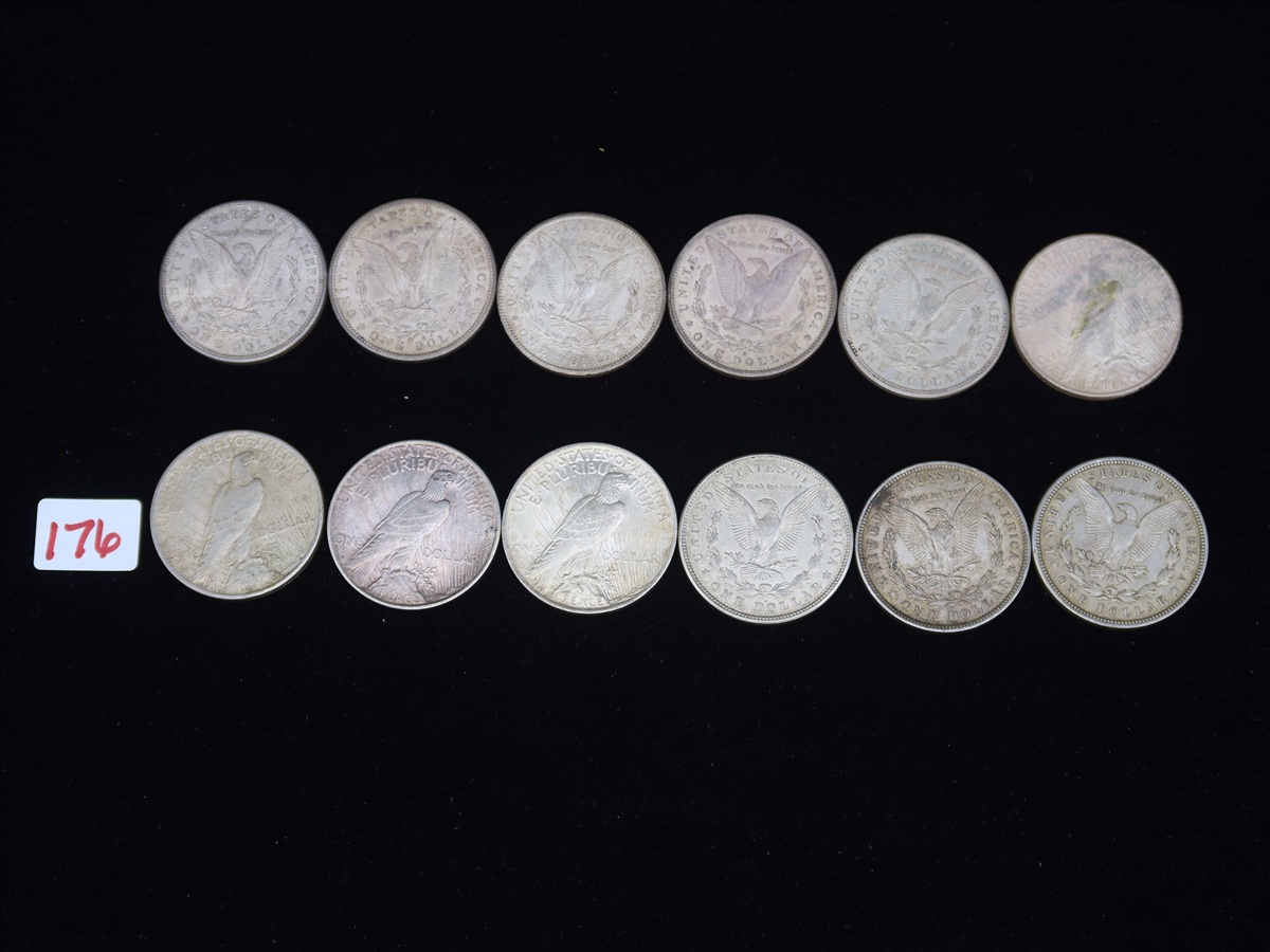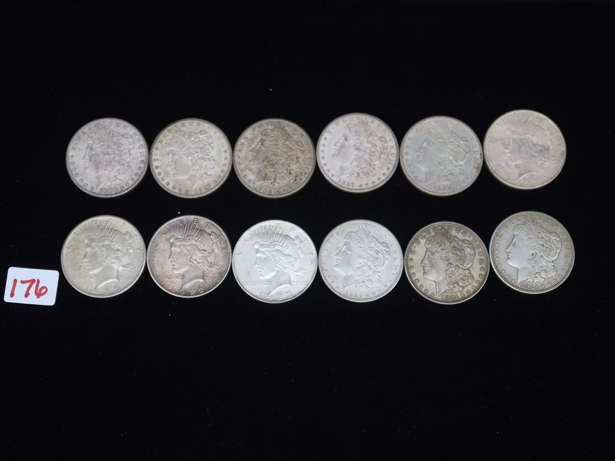 LOT, (1) ASSORTED SILVER DOLLARS TO INCLUDE: (1) 1880-S MORGAN, (2) 1887-S MORGANS, (1) 1902-S MORGAN, (1) 1921-P MORGAN, (1) 1921-S MORGAN, (2) 1921-D MORGAN, (1) 1922-D PEACE, (1) 1923-P PEACE, (1) 1923-S PEACE & (1) 1925-P PEACE IN THIS BAG