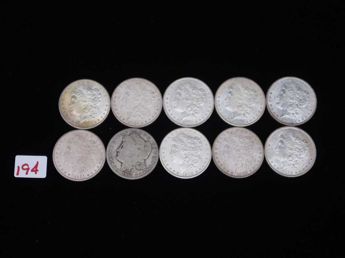 LOT, (10) ASSORTED MORGAN SILVER DOLLARS TO INCLUDE: (6) 1901-0, (1) 1901-S & (3) 1902-O IN THIS BAG