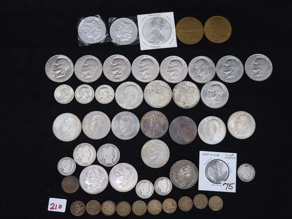 LOT, ASSORTED COINS TO INCLUDE: (1) 1881-S, (1) 1883-O, (1) 1884-O, (1) 1885-P, (1) 1890-P, (1) 1898-P, (1) 1901-O, (1) 1904, (1) 1921-P MORGAN SILVER DOLLARS, (16) IKES, (3) $1 SUSAN B. ANTHONY, (1) 1854-O SEATED LIBERTY, (2) LIBERTY HEAD HALF DOLLARS, (