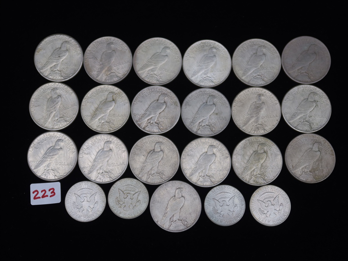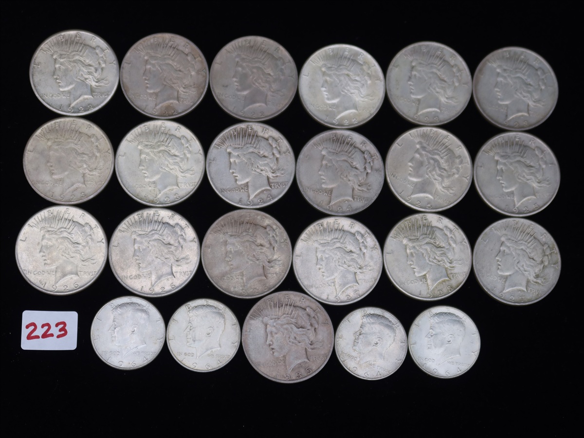 LOT, (19) PEACE SILVER DOLLARS TO INCLUDE: (2) 1922-P, (1) 1922-S, (1) 1922-D, (2) 1923-P, (1) 1923-S, (1) 1923-D, (1) 1924-P, (1) 1925-P, (1) 1925-S, (2) 1926-S, (1) 1926-D, (1) 1927-S, (1) 1927-D, (1) 1928-S, (1) 1935-S & (4) 1964 KENNEDY HALF DOLLARS I