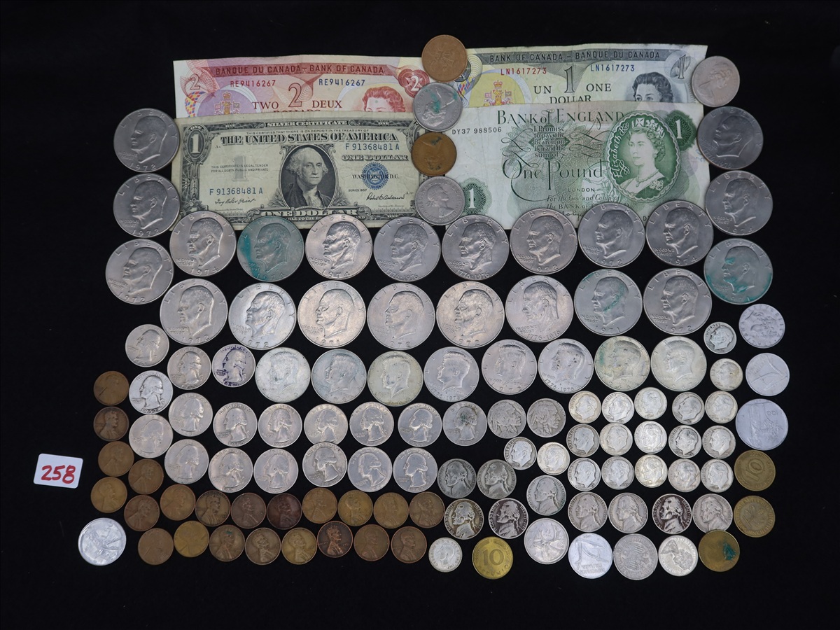 LOT, APPROX (96) ASSORTED COINS TO INCLUDE: (26) $1 IKES, (8) KENNEDY HALVES, (18) QUARTERS, (19) DIMES, (2) BUFFALO NICKELS, (22) CENTS, (1) $1957 SILVER CERTIFICATE & ASSORTED FOREIGN CURRENCY COINS IN THIS BAG