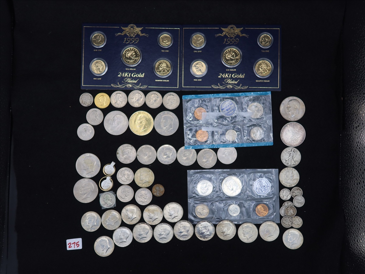 LOT, APPROX (61) ASSORTED COINS TO INCLUDE: (1) 1881 MORGAN, (6) IKES, (11) SUSAN B SILVER DOLLARS, (1) LIBERTY WALKING, (1) FRANKLIN, (22) KENNEDY HALF DOLLARS, (4) WASHINGTON QUARTERS, (8) MERCURY, (2) ROOSEVELT DIMES (1) BUFFALO, (2) JEFFERSON NICKELS,