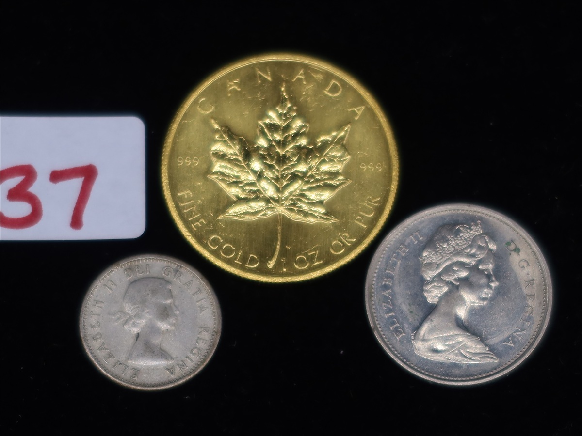 LOT, (1) 1982 $50 CANADIAN GOLD MAPLE LEAF (1 TROY OZ 999 GOLD), (1) 1968 QUARTER & (1) 1962 DIME IN THIS BAG