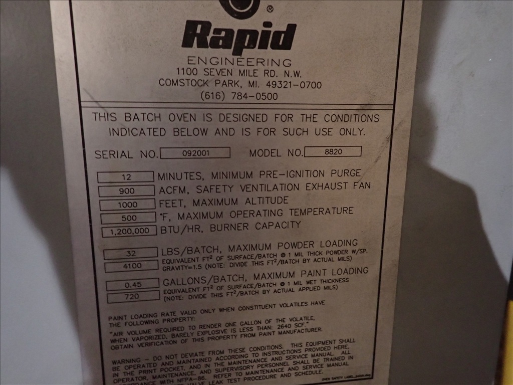 10'X22' 1,200,000 BTU POWDER COAT OVEN, NATURAL GAS MAKEUP AIR, FRONT & REAR DOORS, CONTROLS