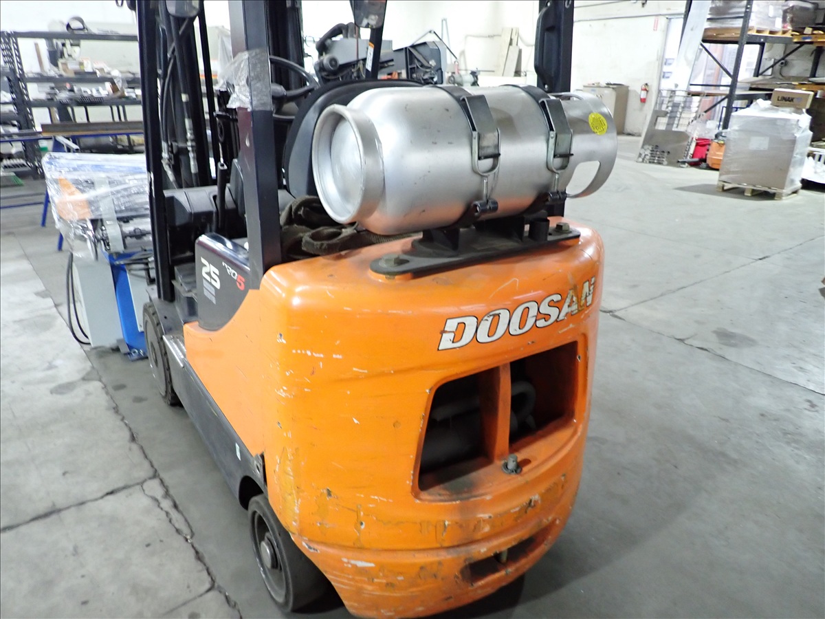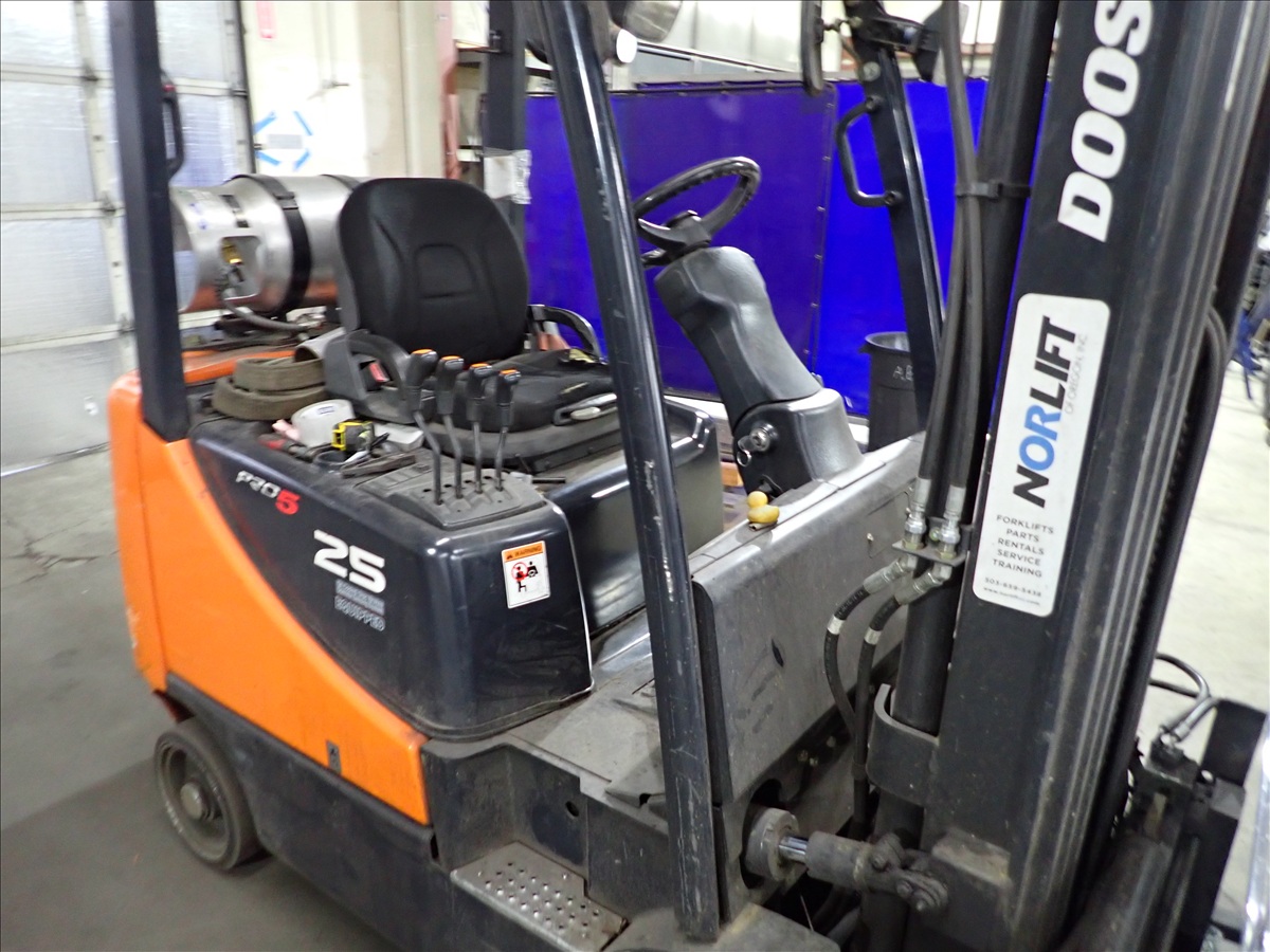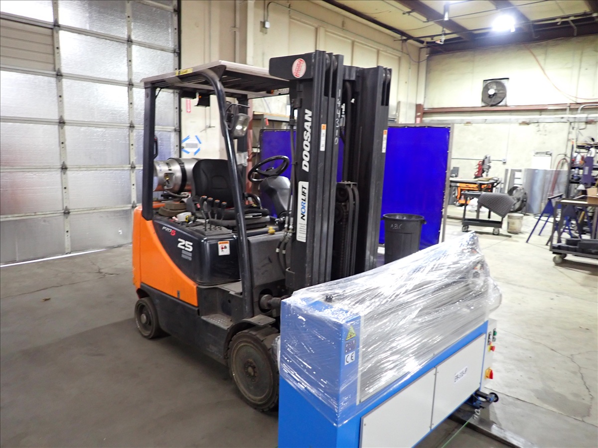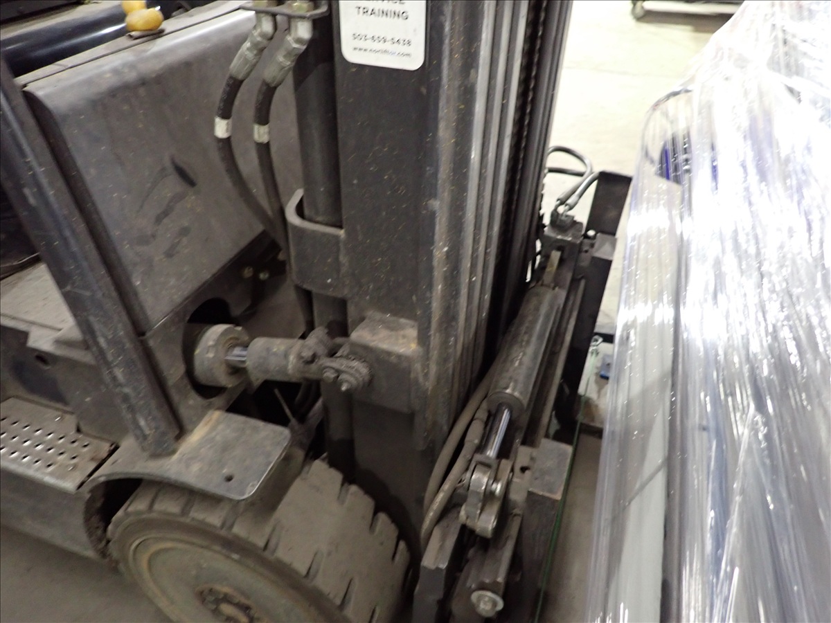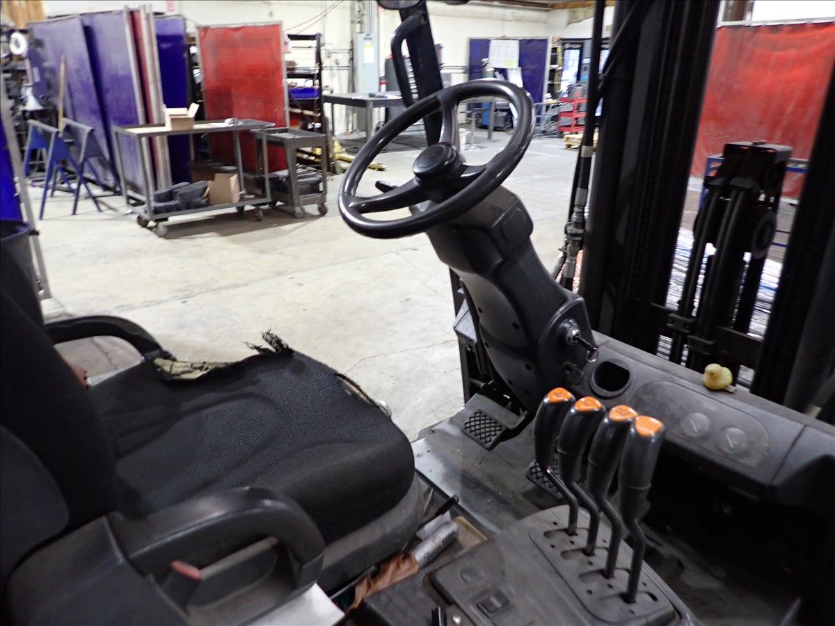 4,200 LB CAP. SOLID TIRED FORKLIFT, 189" 3-STAGE MAST, FORK POSITIONERS, SIDE SHIFT, PROPANE