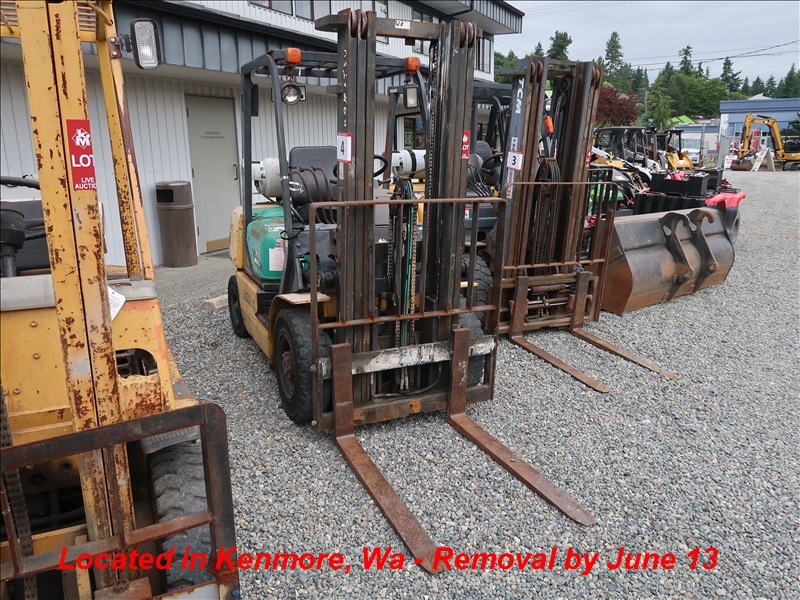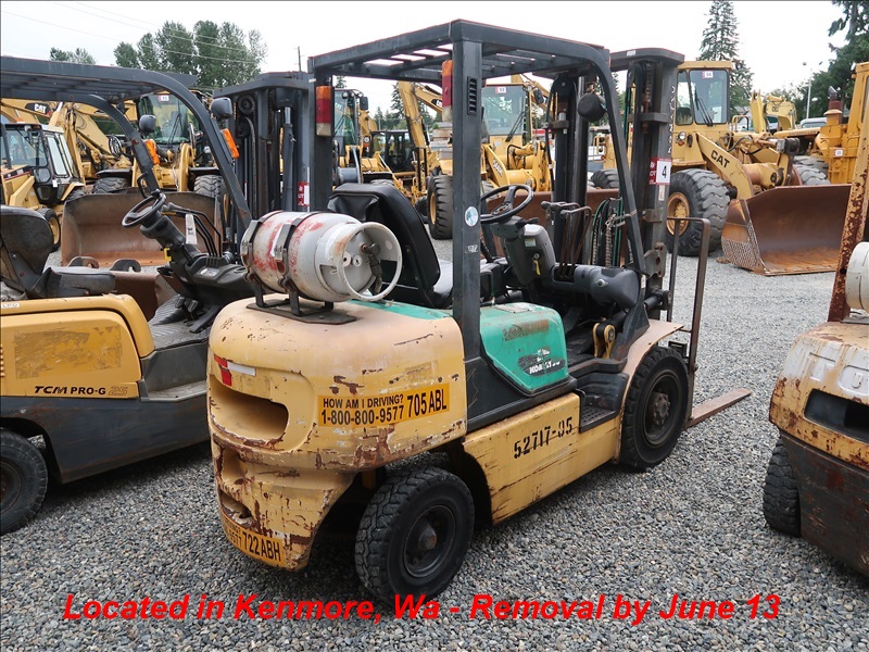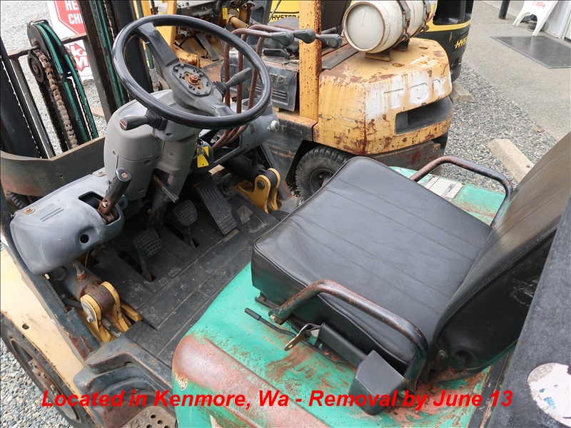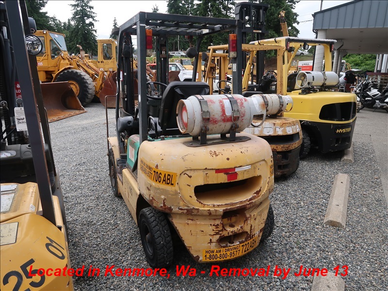 5,000 LB SOLID CUSHION TIREFORKLIFT, 187" FORK HEIGHT,3-STAGE MAST, SIDE SHIFT,4 CYL PROPANEHOUR METER READS: 3,439