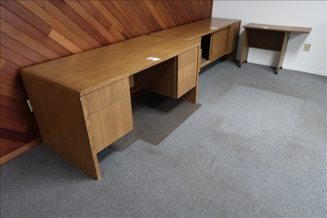 LOT, WOOD DESK, CREDENZA & ROLLING TABLE