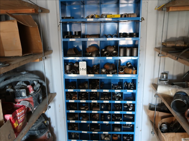 LOT, ASSORTED STEEL FITTINGS IN THIS CABINET W/CABINET