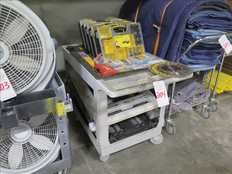 LOT, MISC PARTS, BITS, SAW BLADES, SAWHORSES & POLY CART