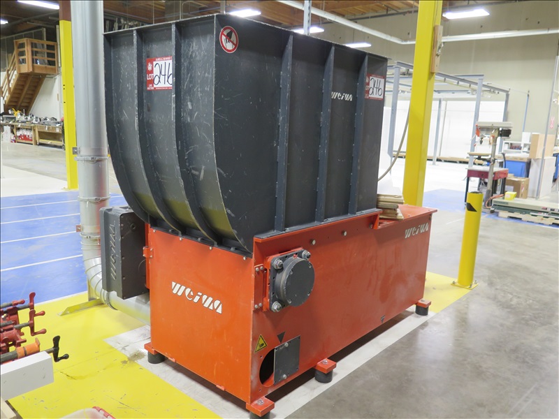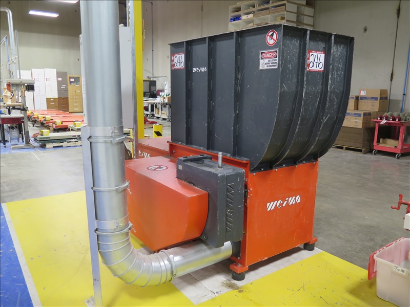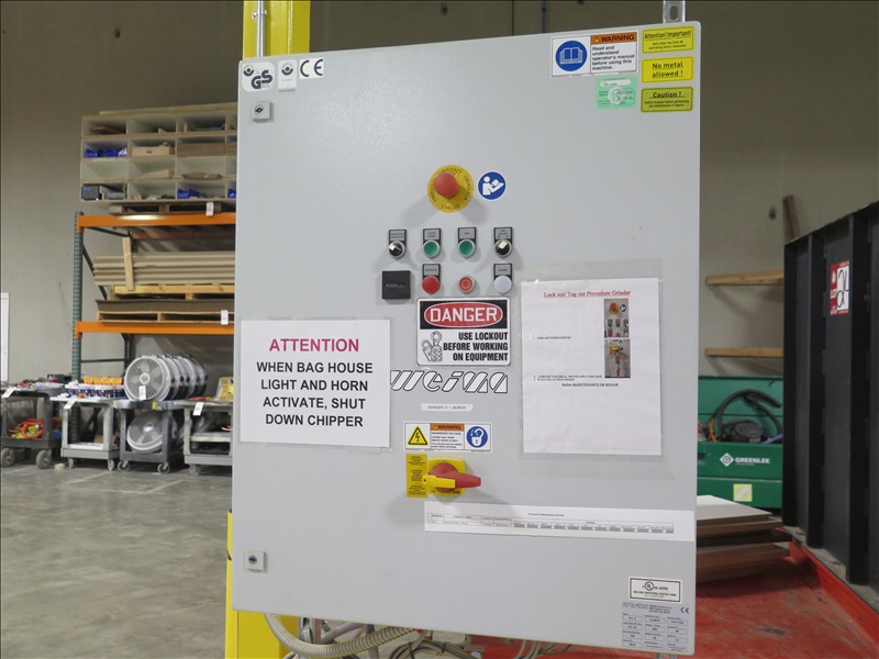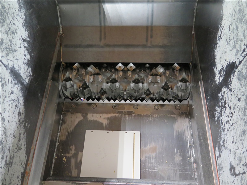 SINGLE SHAFT WOOD WASTE GRINDER/SHREDDER W/BOTTOM DISCHARGE & CONTROL PANEL, 100 RPM, 460V, 3 PHASE, HOUR METER READS: 4,122 W/CONTROL PANEL (DUCTING BREAKS AT 1ST JOINT)