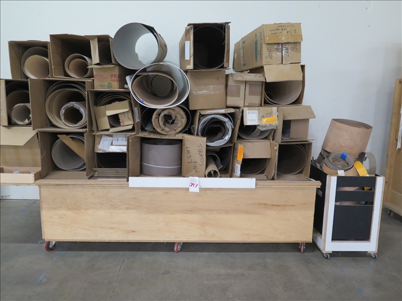 LOT, ASSORTED LAMINATE & VENEER ON THIS CART W/8' WOOD CART ON CASTERS & SMALL SIDE CART