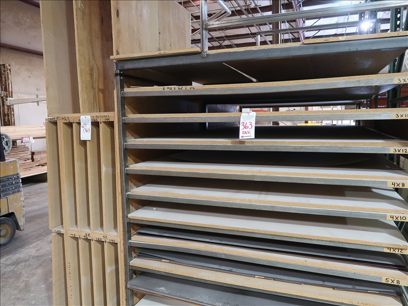 LOT, 6'H X 5'W X 10' STEEL SHEET RACK W/WOOD RACKS & MATERIAL