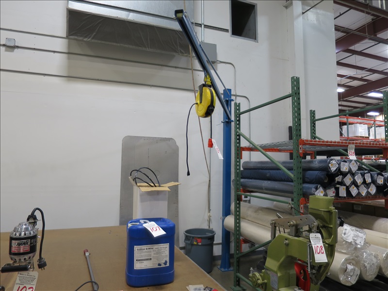 10' H, 50 LB FLOOR MOUNTED JIB W/PRO-REEL 120V ELECTRICAL REEL MOUNTED ON TROLLY & 10' JIB ARM ($50 REFUNDABLE DEPOSIT REQUIRED, BUYER MUST GRIND FLOOR BOLTS TO GROUND HEIGHT)