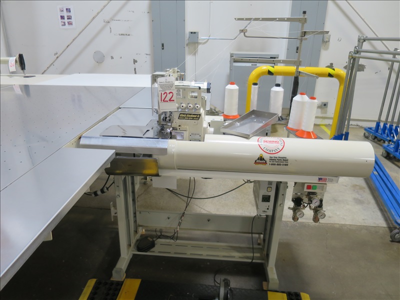 HIGH LIFT FOOT PANEL FLANGER W/JUKI MO-6916G SERGER HEAD & (2) 4' X 8' AIR TABLES, 220V, SINGLE PHASE