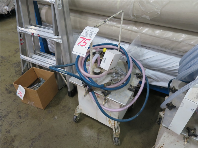 WATER BORNE ADHESIVE APPLICATOR ON CASTERS W/HOSE & SIMALFA SPRAY GUN (ADHESIVE IS LOT 87)