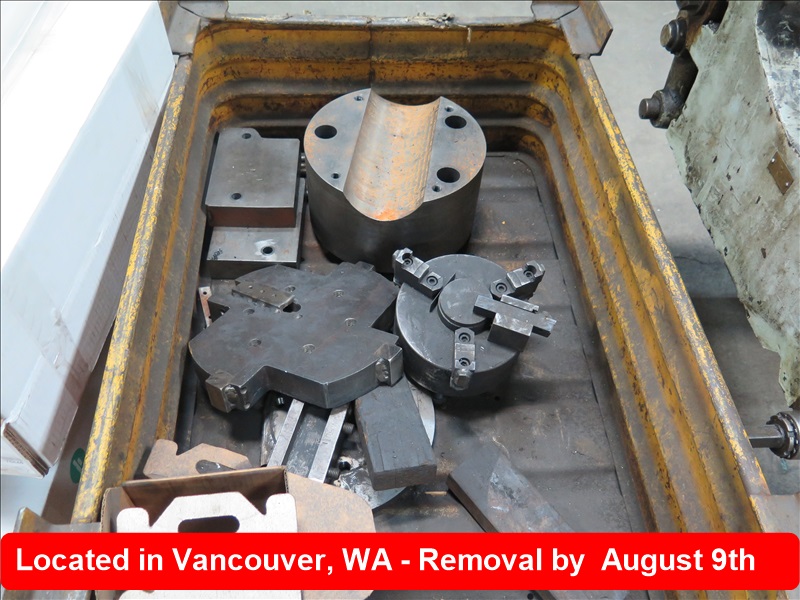 56" SLIDING GAP, 30" SWING OVER WAYS, 17' CLOSED, 12" IN THE GAP, 26'6" CENTERS, GAP BED LATHE, (2) 4-JAW, (1) 3-JAW CHUCK, (3) STEADY RESTS, TOOL POST HOLDER, TAIL STOCK