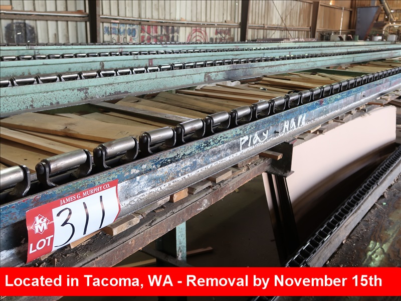 APPROX 110' 4-STRAND 4" STEEL ROLLTOP DRY CHAIN TRANSFER W/H-SHAFT, T-SPROCKETS, STEEL RACES, SUPPORTS & PROPORTIONAL WOOD WALKWAY