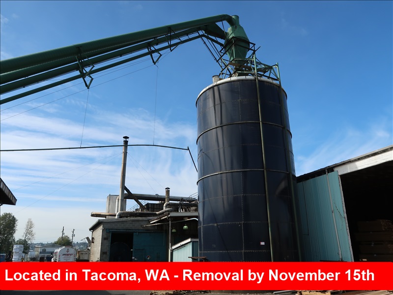 APPROX 25' DIA X 50'H ALL STEEL BOLT TOGETHER FUEL SILO, APPROX 175-DRY TON CAPACITY W/APPROX 10' DIA CYCLONE & PIPING TO 1ST SUPPORT ON TOP OF PLANER MILL BUILDING, SWEEP & EXIT AUGER W/APPROX 20" FAN (LOCATED BY KILNS)