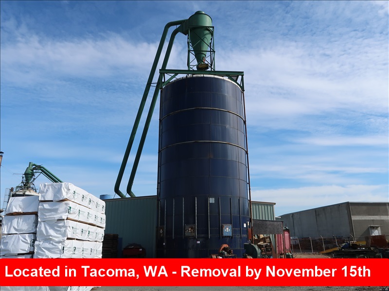 APPROX 25' DIA X 65'H ALL STEEL BOLT TOGETHER FUEL SILO, APPROX 260-DRY TON CAPACITY W/APPROX 10' DIA CYCLONE & PIPING TO FANS & WALL OF PLANER MILL BUILDING, SWEEP & (1) EXIT AUGER W/RELIANCE VS500 DRIVE & MARKED ELECTRICS, APPROX 24" FAN W/MOTOR (NO LOO