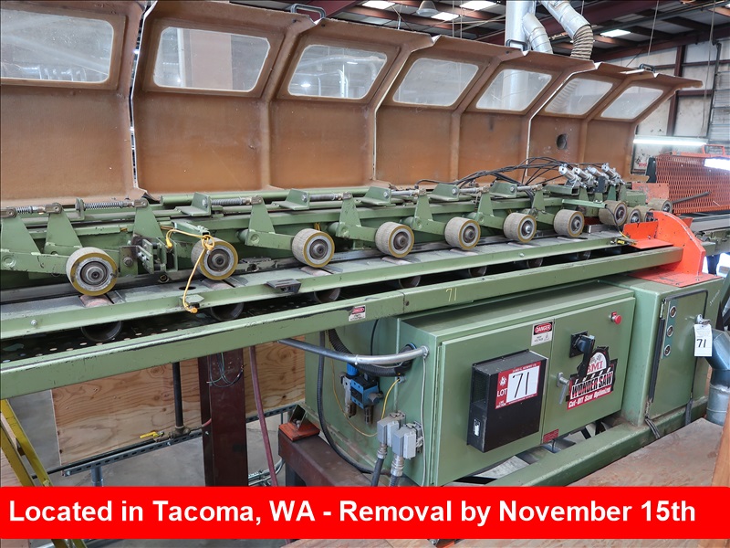 TURBO WONDER CUT OFF SAW OPTIMIZER W/7-1/2 HP SAW, (12) 6" BOTTOM FEED ROLLS, (12) 3-1/2" HOLD DOWN ROLLS, MARKED ELECTRICS & CONTROL, STEEL SUPPORTS & WOOD WALKWAY, PIPING TO 1ST JOINT