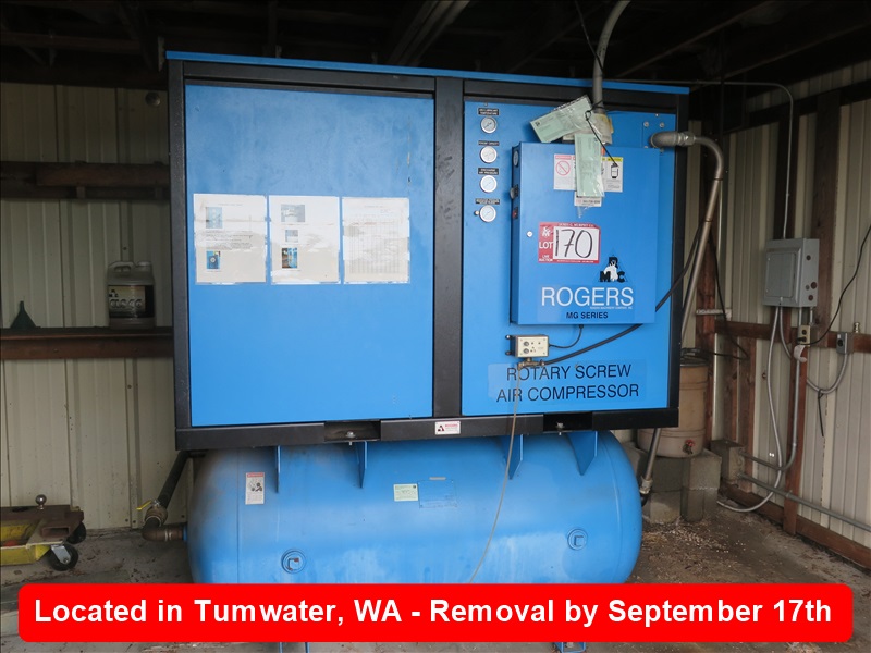 40 HP ROTARY SCREW AIR COMPRESSOR W/HORIZONTAL TANK, 230/460V, 3 PHASE, HOUR METER READS: 30,245 **AIRLINE BREAKS & 1ST VALVE, POWER BREAKS @ SAFETY SWITCH, SAFETY SWITCH STAYS W/BUILDING**