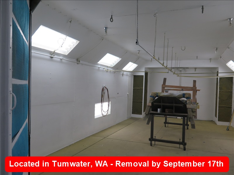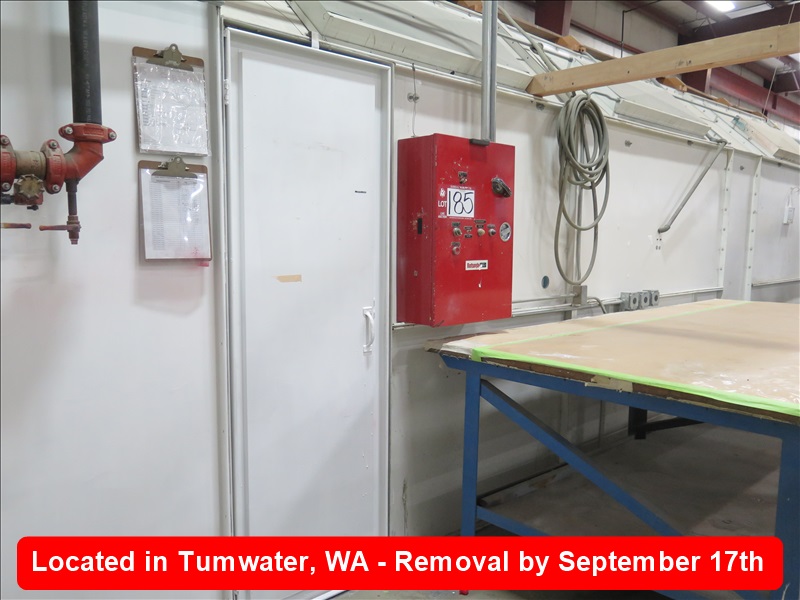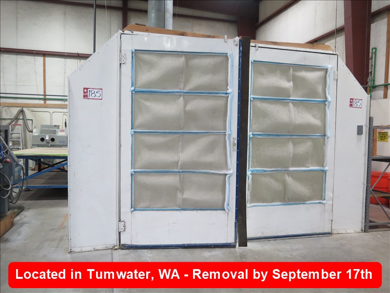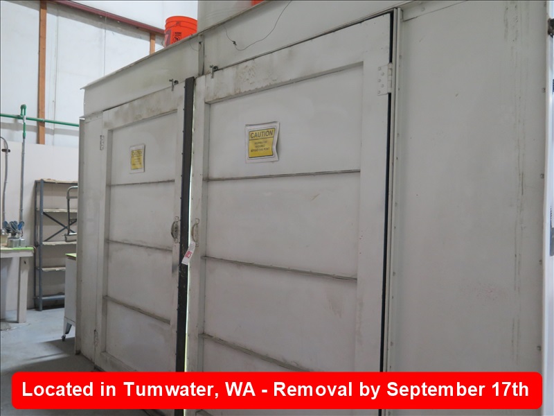 APPROX 14' X 24' DUAL DOUBLE DOOR DRIVE IN PAINT BOOTH, (8) 4-LIGHT LIGHT FIXTURES, 9-HEAD SPRINKLER SYSTEM ($1,000 REFUNDABLE DEPOSIT REQUIRED TO DISCONNECT THE SPRINKLER SYSTEM PROPERLY, EXHAUST TERMINATES AT THE ROOF, NOTHING ON THE TOP OF THE ROOF IS