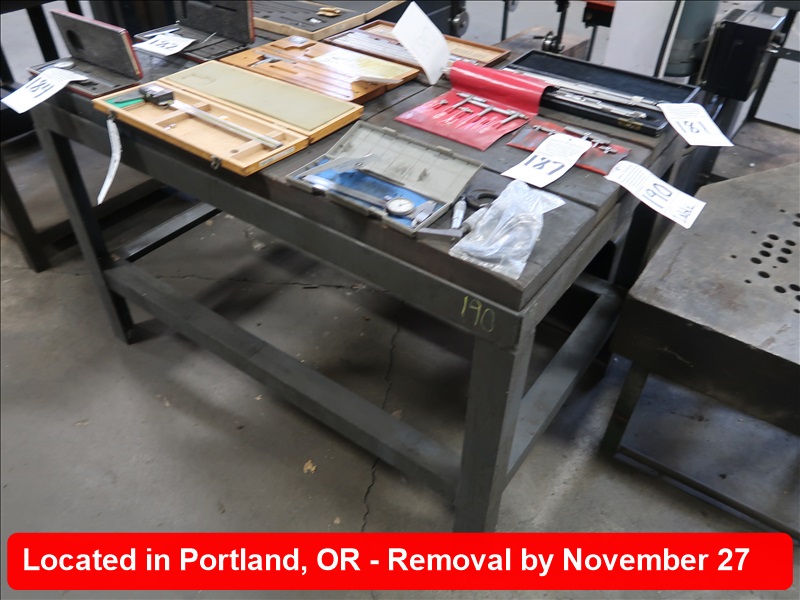 APPROX 30" X 98" STEEL FRAMED WOOD TOP TABLE (MUST WAIT UNTIL EMPTY TO REMOVE)